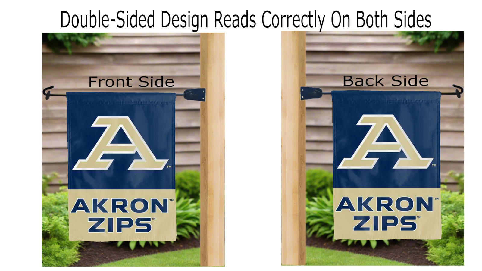 Decorate your yard with this Officially Licensed, 13" x 18" Akron Garden Flag! This flag is the result of two flags being screen printed and sewn together, making the logo look clear and read correctly on both sides of this 2-ply polyester flag. A middle liner is also sewn in between the two flags to stop the see-through. The sleeve across the top also makes it easy to insert the flag into the flag stand. No matter who you are, this garden flag is a spendid choice for any Akron fans looking to add some flair to your yard, porch, entryway, or garden.
