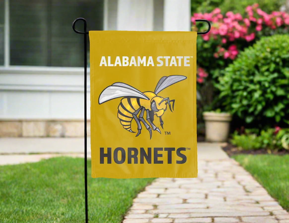 Decorate your yard with this Officially Licensed Alabama State University 13x18 Garden Flag with Hornets Logo! Made of 2-ply polyester, this 13" x 18" flag is the result of two dye-sublimated flags sewn together with a middle liner sewn in between them to stop the see-through, allowing the Alabama State Logo and Hornets logo to look clear and read correctly on both sides. The sleeve across the top makes it easy for you to insert the flag into your garden flag stand. No matter who you are, this garden flag is a splendid choice for any Alabama State University fans looking to add some flair to their yard, porch, entryway, or garden.