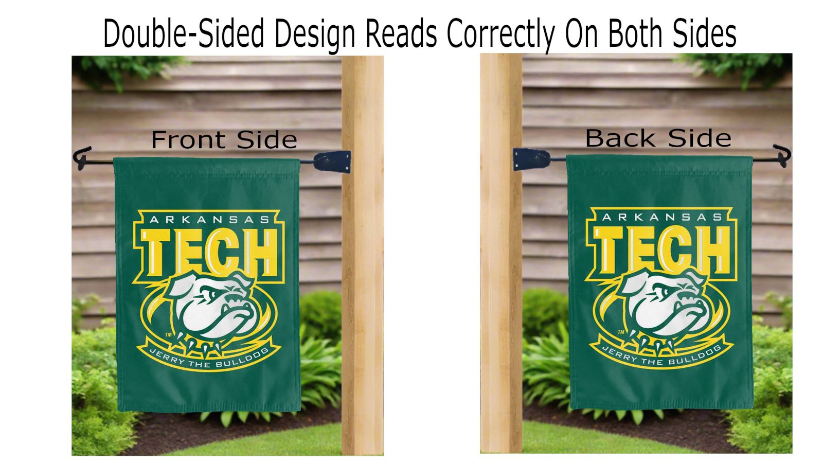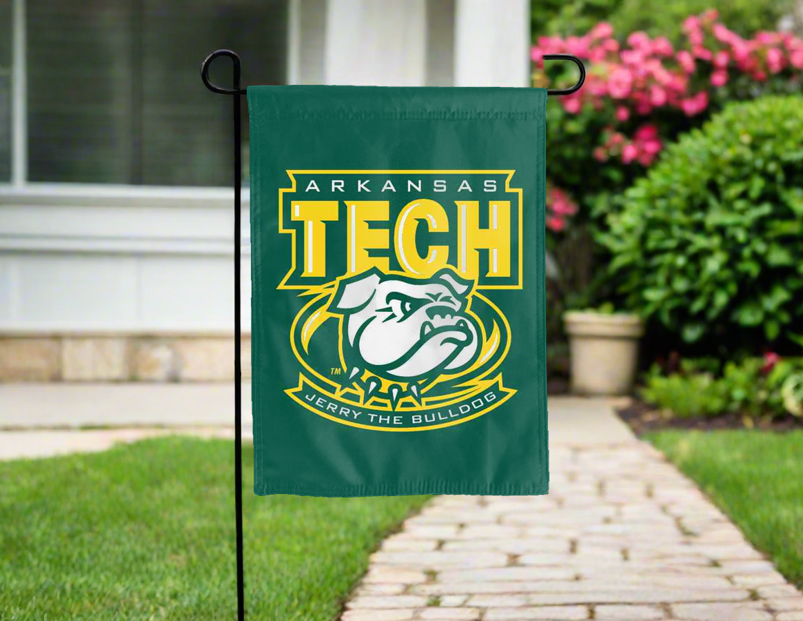 Decorate your yard with this Officially Licensed, 13" x 18" green Arkansas Tech University Garden Flag! Made of 2-ply polyester, this flag is the result of two dye-sublimated flags sewn together with a middle liner sewn in between them to stop the see-through, allowing the logo to look clear and read correctly on both sides. The sleeve across the top makes it easy for you to insert the flag into your garden flag stand. No matter who you are, this garden flag is a splendid choice for any Arkansas Tech University fans looking to add some flair to their yard, porch, entryway, or garden.