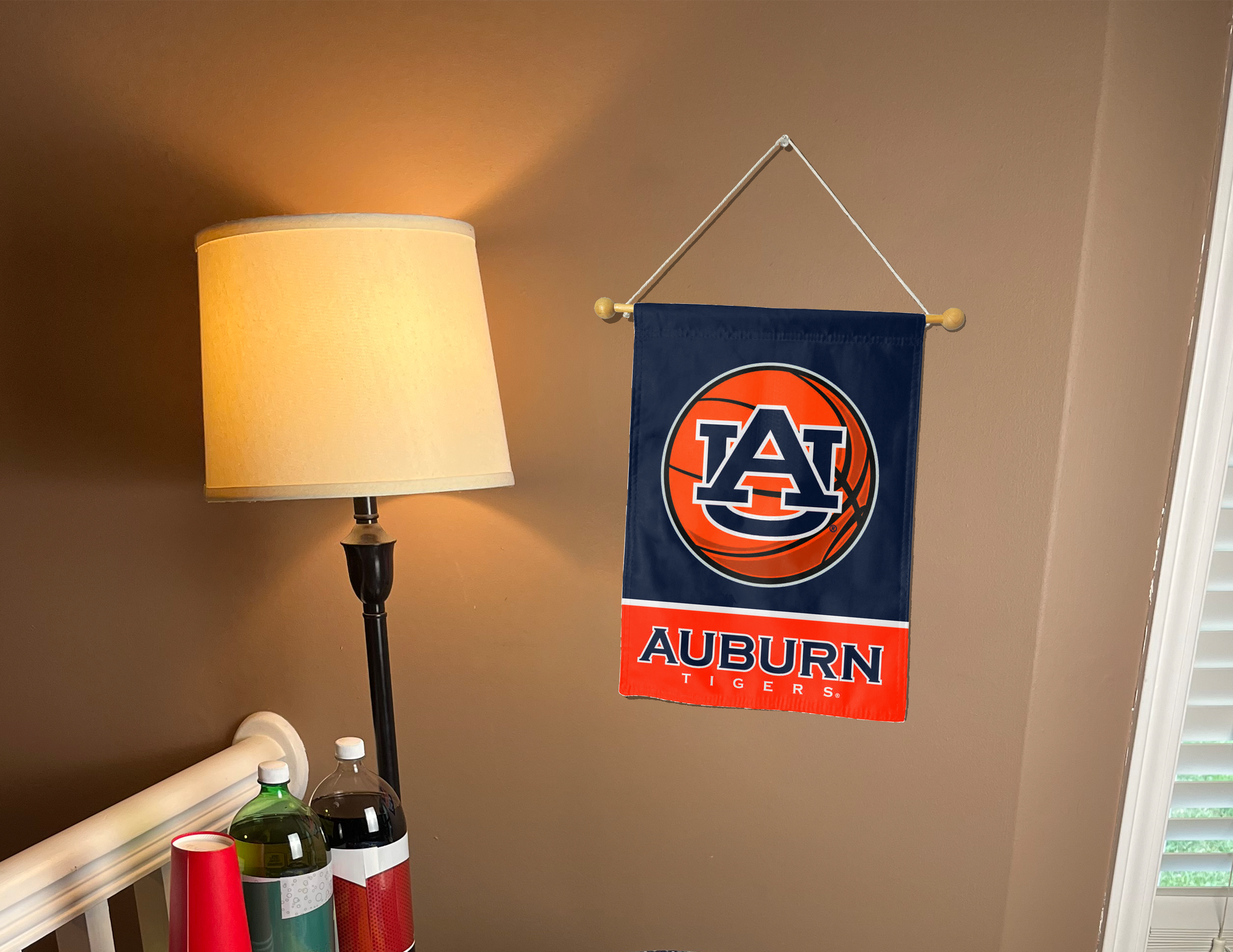 • Load image into Gallery viewer, auburn basketball garden flag hung inside a room for college dorm decor