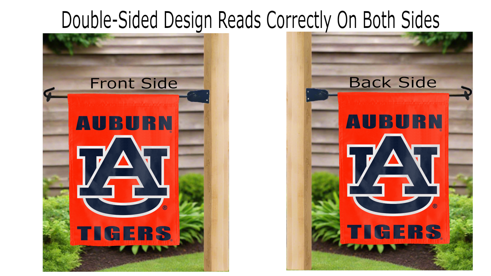 Measuring 13" x 18", this double sided garden flag allows the Auburn AU Tigers logo to read correctly on both sides, making your loyalty to the Tigers absolutely clear no matter which side you stand on. The sleeve at the top allows you to easily hang it outside your yard on a garden flag stand or inside your fan cave on a banner pole.