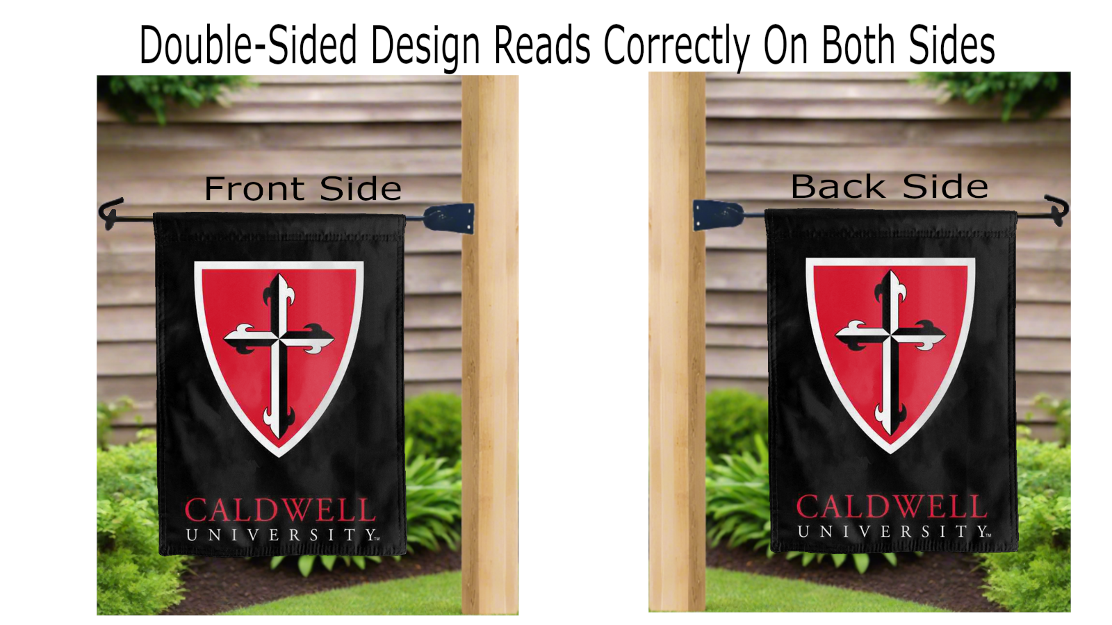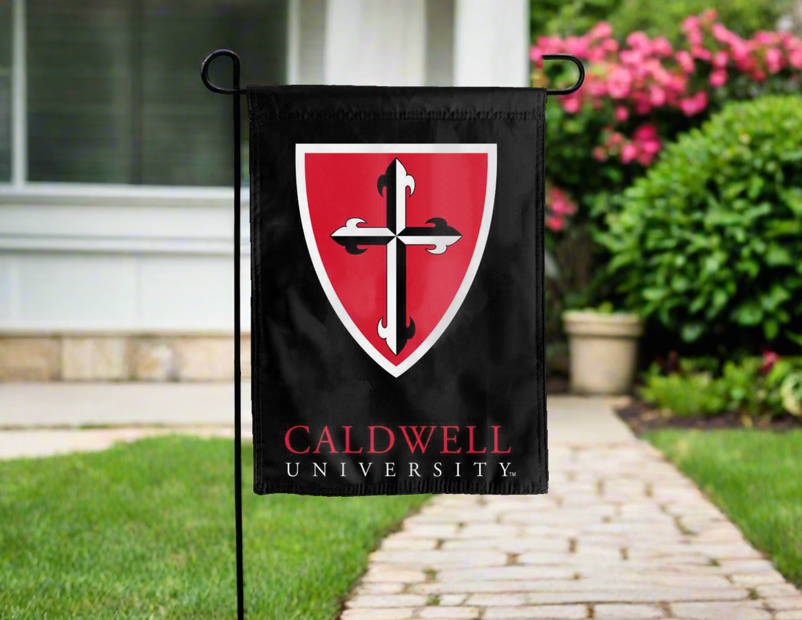 caldwell university shield logo reading correctly on both sides of black double sided garden flag