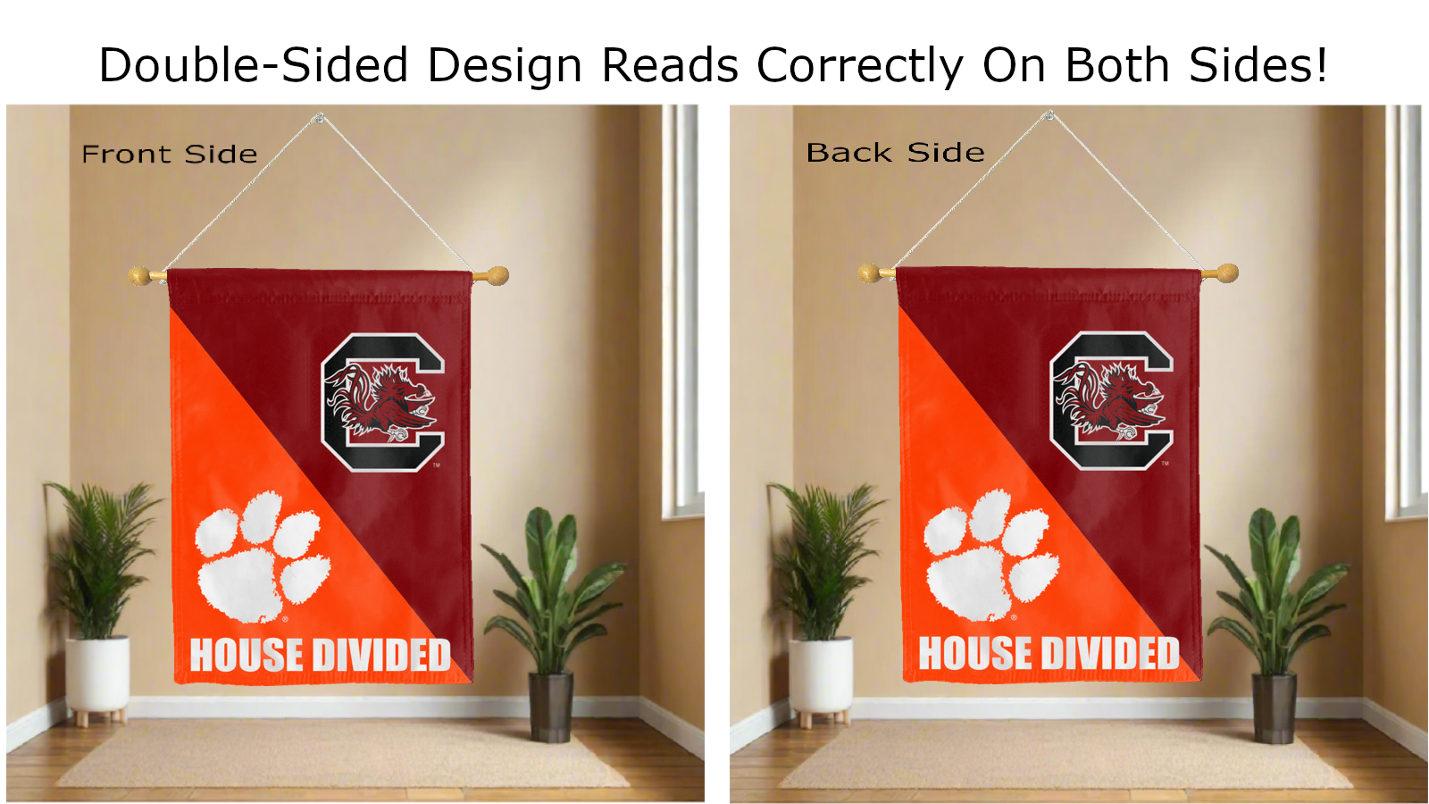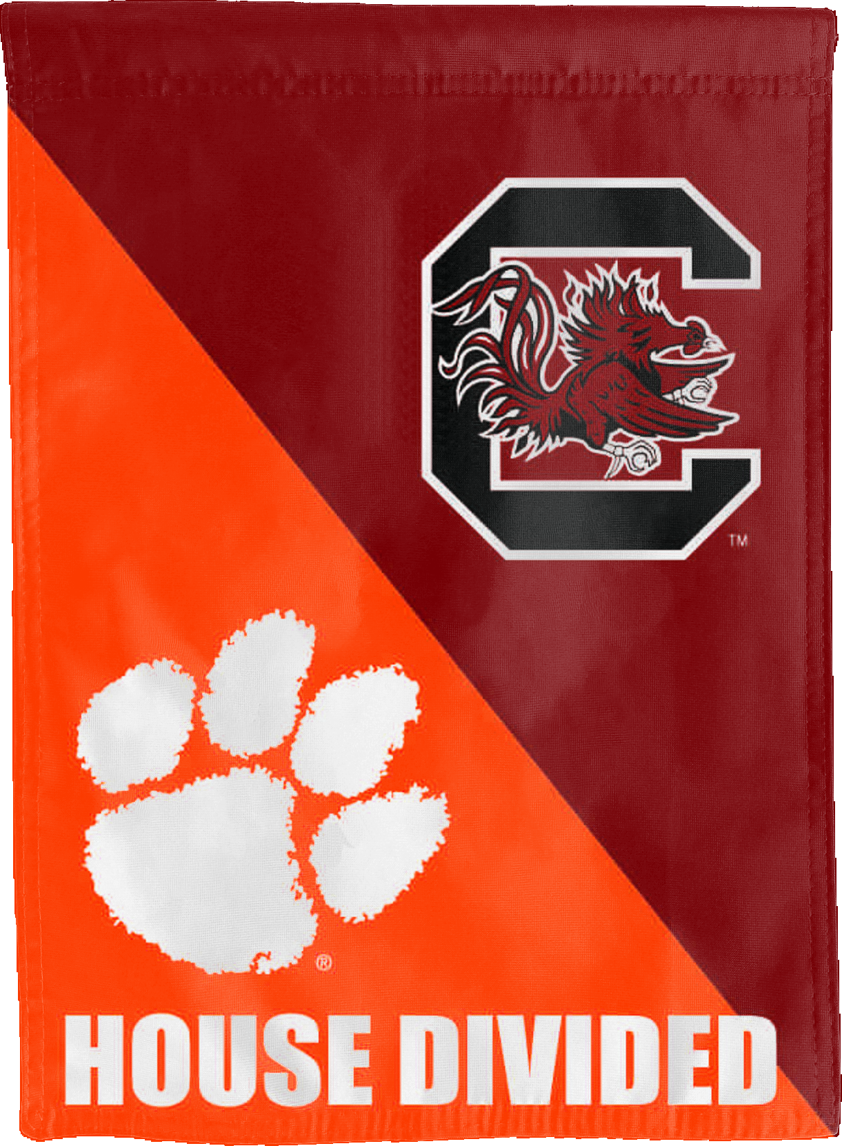 What better way to spice up a plain room than with this Officially Licensed University of South Carolina Clemson University House Divided House Flag! Measuring 30" x 40", this house flag is the product of two screen-printed flags sewn together with a middle liner sewn in between the two flags to stop the see through and allow the logos to read correctly on both sides. The sleeve across the top also makes it easy to insert into the flagpole or flag hanger if you choose to hang it outside your home. Regardless of where you decide to hang it, this University of South Carolina Clemson University House Divided House Flag is sure to reflect your appreciation for both teams any day of the week.