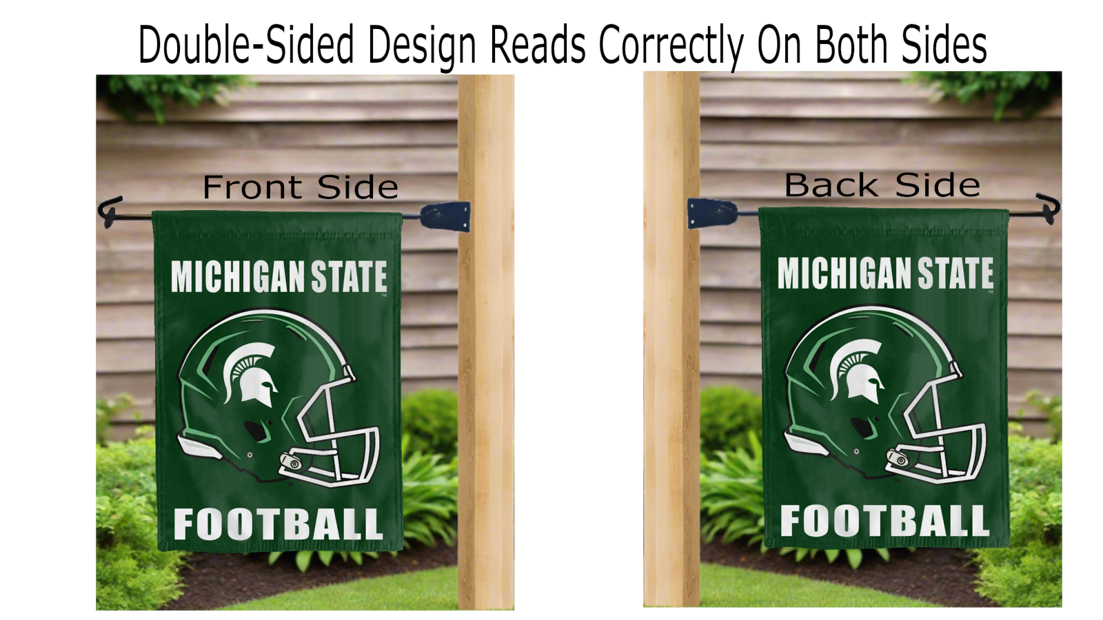 Show your school pride with this NCAA Officially Licensed 13x18 Michigan State Football Garden Flag with Football Helmet Logo!! This garden flag is the result of two flags being sewn together with a middle liner sewn in between them to stop the see-through and allow the Michigan State Football logo to look and read correctly on both sides of this 13" x 18" garden flag. The sleeve across the top makes it easy for you to insert the flag into your garden flag stand.