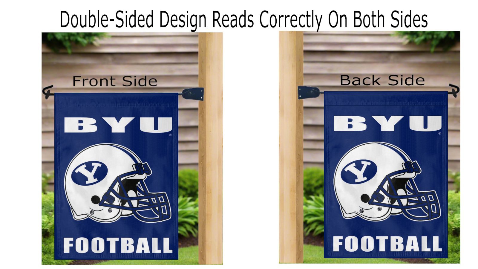 Decorate your yard with this Officially Licensed 13" x 18" BYU Garden Flag! Made of 2-ply polyester, this flag is the result of two dye-sublimated flags sewn together with a middle liner sewn in between them to stop the see-through, allowing the logo to look clear and read correctly on both sides. The sleeve across the top makes it easy for you to insert the flag into your garden flag stand. No matter who you are, this garden flag is a splendid choice for any BYU fans looking to add some flair to their yard, porch, entryway, or garden.