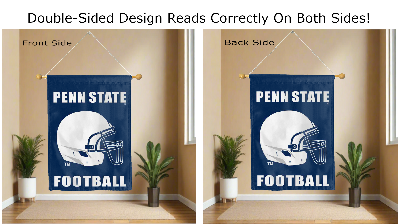 Break the monotonous look of your room with this Officially Licensed Penn State Football House Flag! Measuring 30" x 40", this house flag is the product of two screen-printed flags sewn together with a middle liner sewn in between the two flags to stop the see-through and allow the logo to read correctly on both sides. The sleeve across the top also makes it easy to insert the flag into a flagpole or flag hanger if you choose to hang it outside your home. Regardless of where you choose to hang it, this Penn State House Flag is sure to reflect your school pride any day of the week.