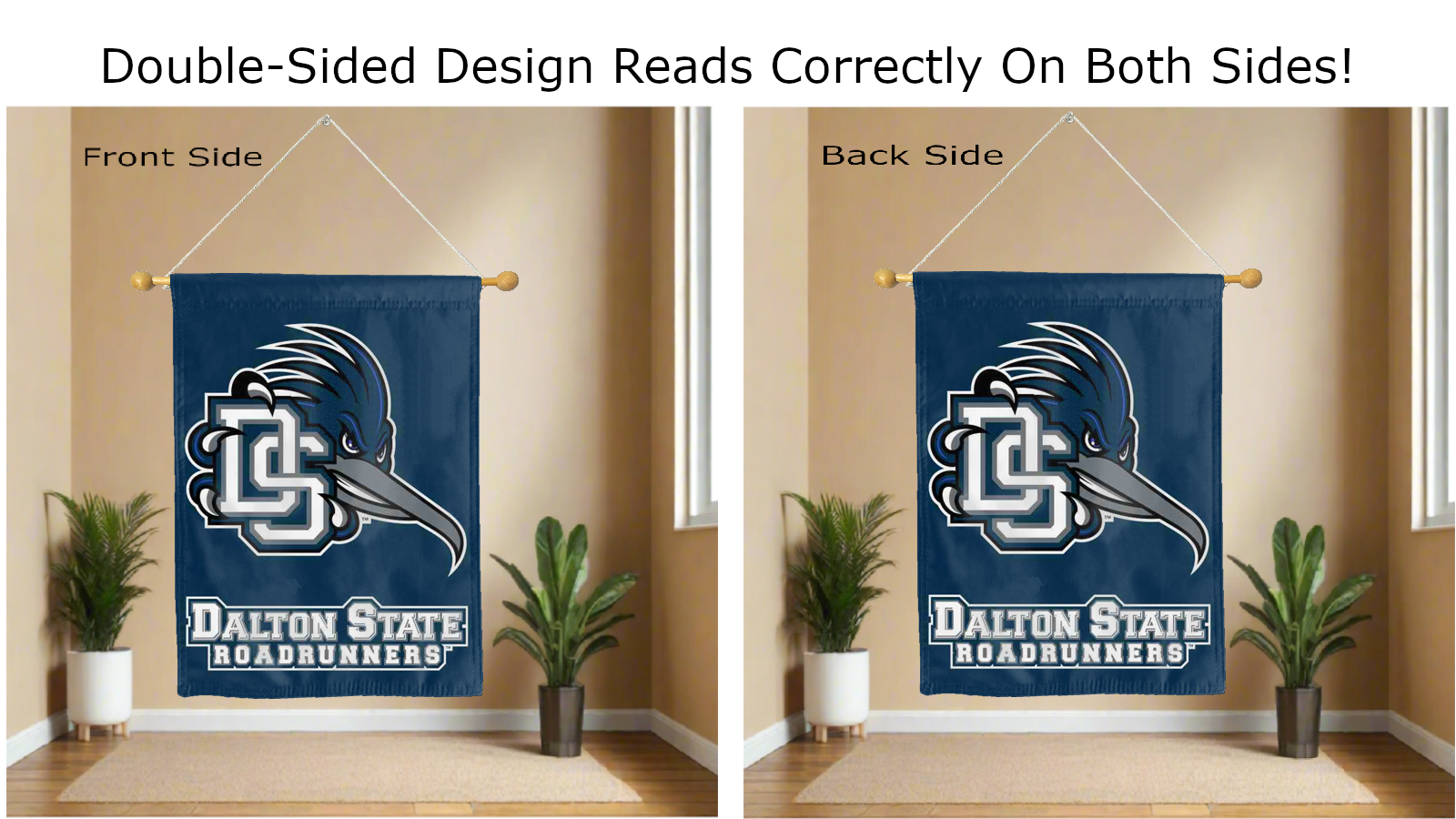 Break the monotonous look of your room with this Officially Licensed Dalton State College Roadrunners Double Sided House Flag! Measuring 30" x 40", this house flag is the product of two screen-printed flags sewn together with a middle liner sewn in between the two flags to stop the see-through and allow the Dalton State College Roadrunners logo to read correctly on both sides. The sleeve across the top also makes it easy to insert the flag into a flagpole or flag hanger if you choose to hang it outside your home. Regardless of where you choose to hang it, this Dalton State College Roadrunners Double Sided House Flag is sure to reflect your school pride any day of the week.