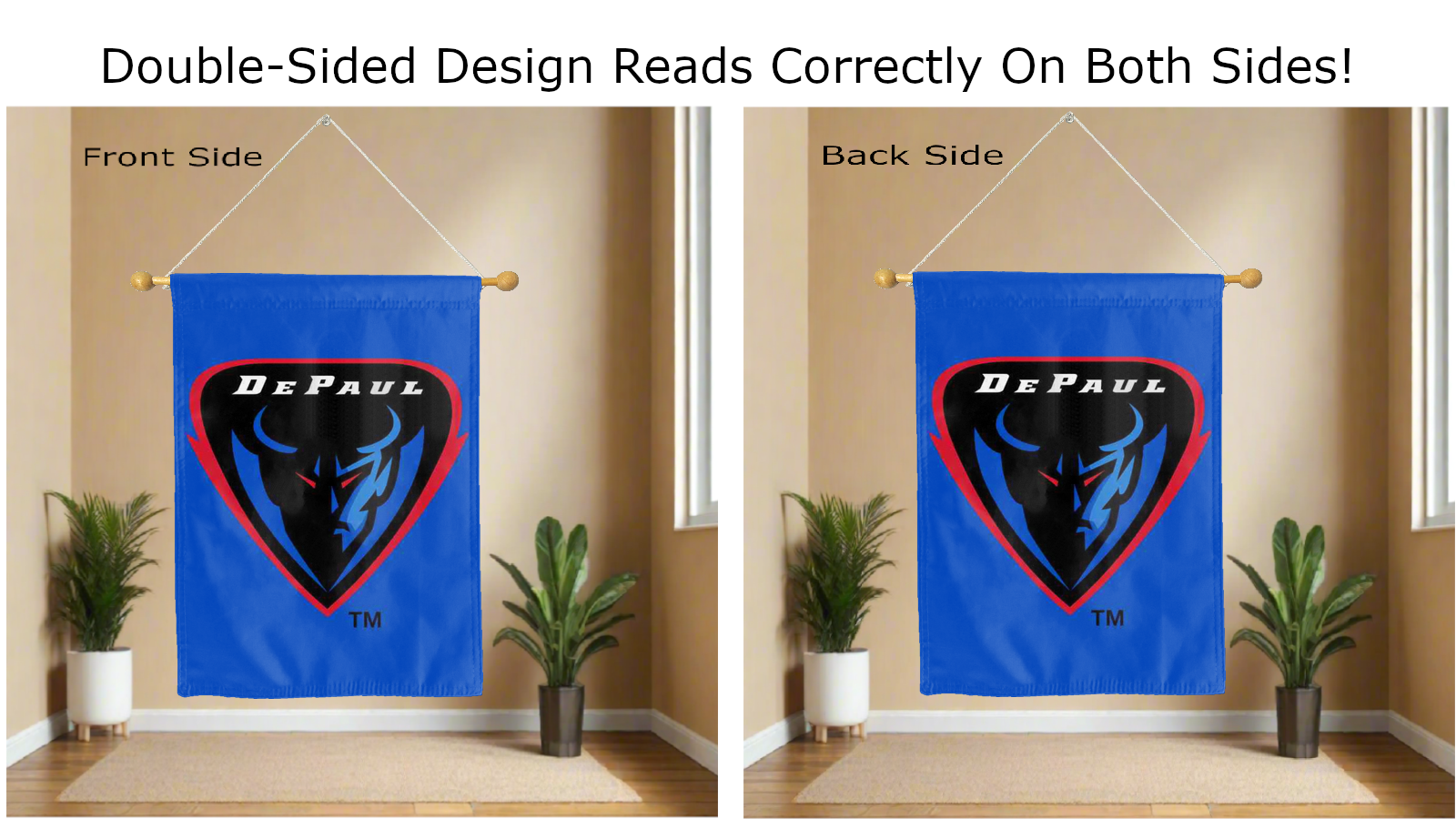 Break the monotonous look of your room with this Officially Licensed DePaul University Double Sided House Flag! Measuring 30" x 40", this house flag is the product of two screen-printed flags sewn together with a middle liner sewn in between the two flags to stop the see-through and allow the logo to read correctly on both sides. The sleeve across the top also makes it easy to insert the flag into a flagpole or flag hanger if you choose to hang it outside your home. Regardless of where you choose to hang it, this DePaul University Double Sided House Flag is sure to reflect your school pride any day of the week.