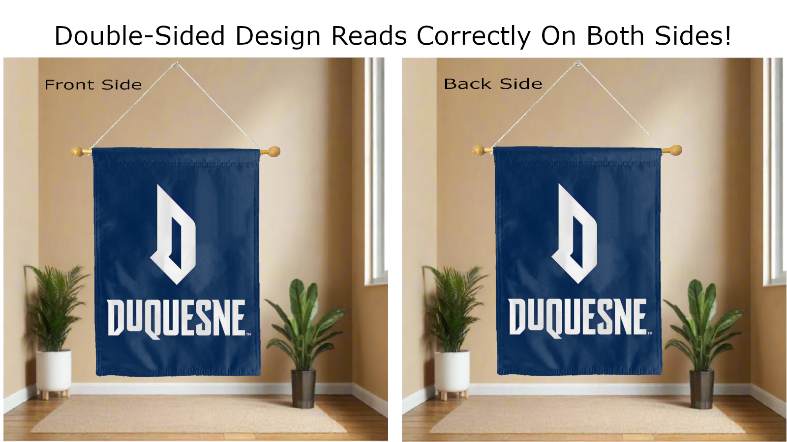 duquesne university logo reading correctly on both sides of blue double sided house flag