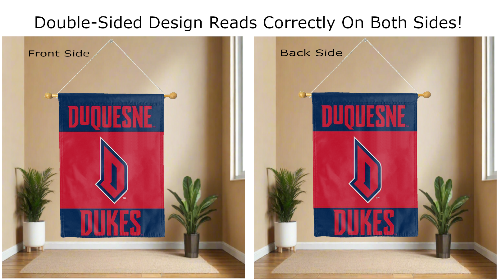 Break the monotonous look of your room with this Officially Licensed Duquesne University Dukes House Flag! Measuring 30" x 40", this house flag is the product of two screen-printed flags sewn together with a middle liner sewn in between the two flags to stop the see-through and allow the Duquesne University Dukes logo to read correctly on both sides. The sleeve across the top also makes it easy to insert the flag into a flagpole or flag hanger if you choose to hang it outside your home. Regardless of where you choose to hang it, this Duquesne University Dukes House Flag is sure to reflect your school pride any day of the week.