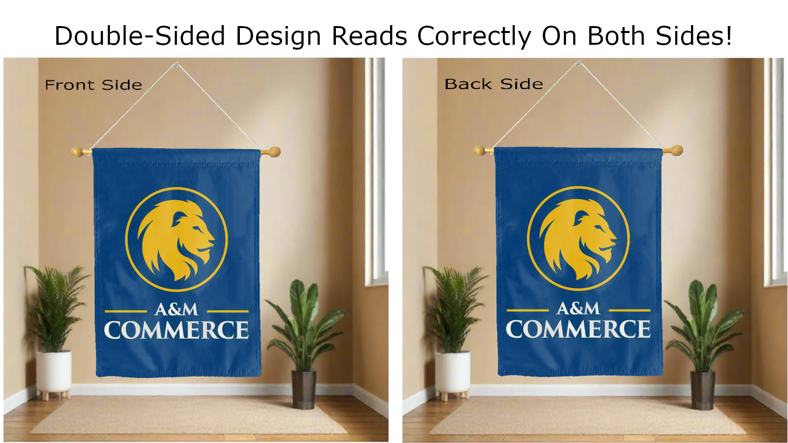 Break the monotonous look of your room with this Officially Licensed East Texas A&M University-Commerce House Flag! Measuring 30" x 40", this house flag is the product of two screen-printed flags sewn together with a middle liner sewn in between the two flags to stop the see-through and allow the logo to read correctly on both sides. The sleeve across the top also makes it easy to insert the flag into a flagpole or flag hanger if you choose to hang it outside your home. Regardless of where you choose to hang it, this East Texas A&M University-Commerce House Flag is sure to reflect your school pride any day of the week.