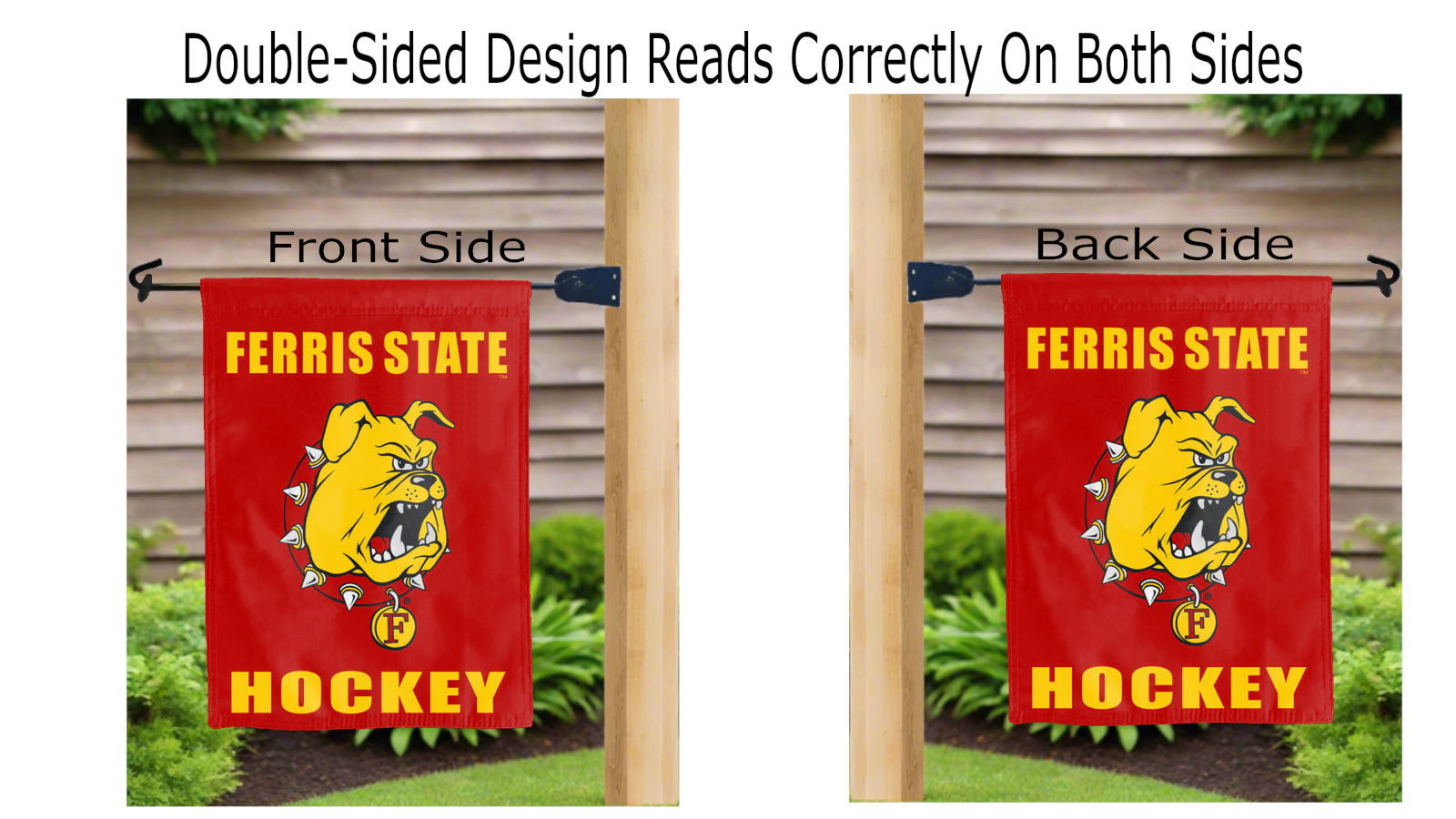 Let your voice scream "Go Bulldogs!" with this NCAA Officially Licensed 13" x 18" Ferris State University Hockey Garden flag! Made of 2-ply polyester, this flag is the result of two dye-sublimated flags sewn together with a middle liner sewn in between them to stop the see-through, allowing the Ferris State University Hockey logo to look clear and read correctly on both sides. The sleeve across the top makes it easy for you to insert the flag into your garden flag stand. No matter where you are, this garden flag is sure to make it clear your loyalty lies with the Ferris State University Bulldogs on game day.