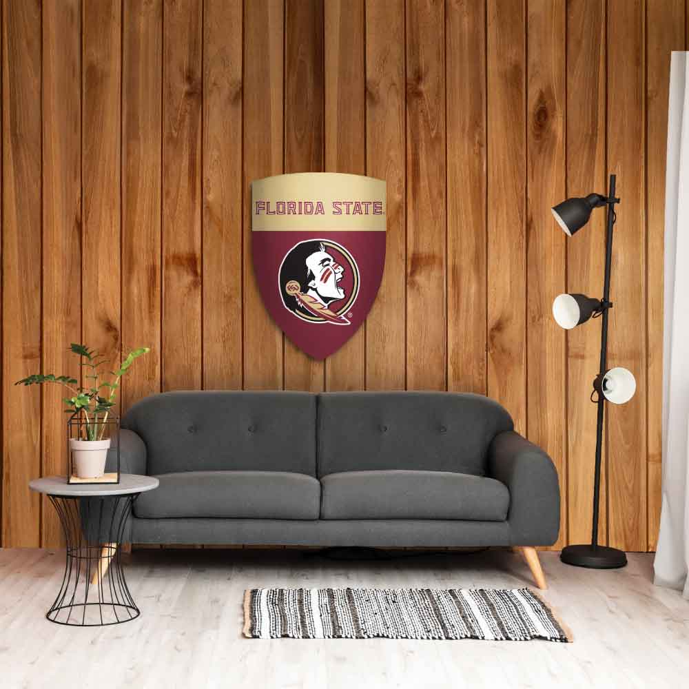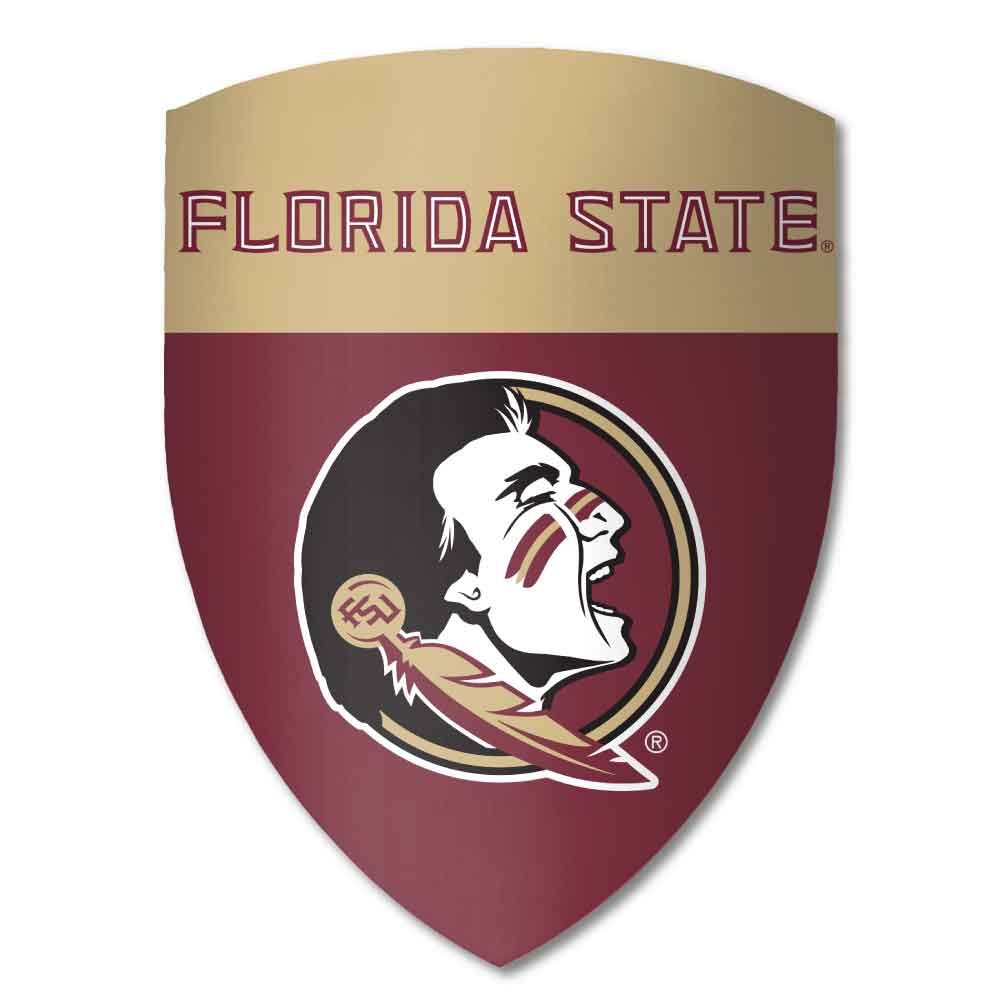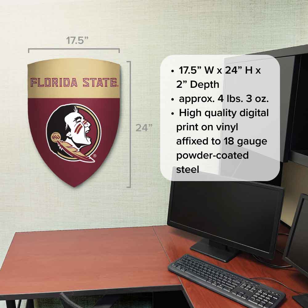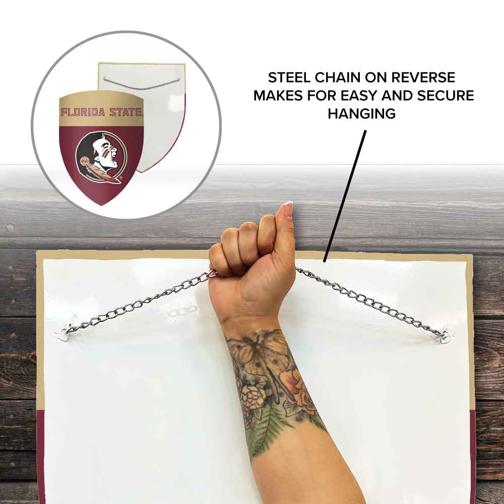 Decorate your home with this Officially Licensed, 17.5" x 24" Florida State University Seminoles Medieval Shield!! Printed right here in the U.S.A., this medieval shield includes a steel chain on the back side, making it both easy and secure to hang. The university logo is digitally printed onto this metal shield, making it the perfect choice for you Florida State Seminoles Fans looking to showcase your school pride while at the same time giving your home decor that Florida State flair it deserves.