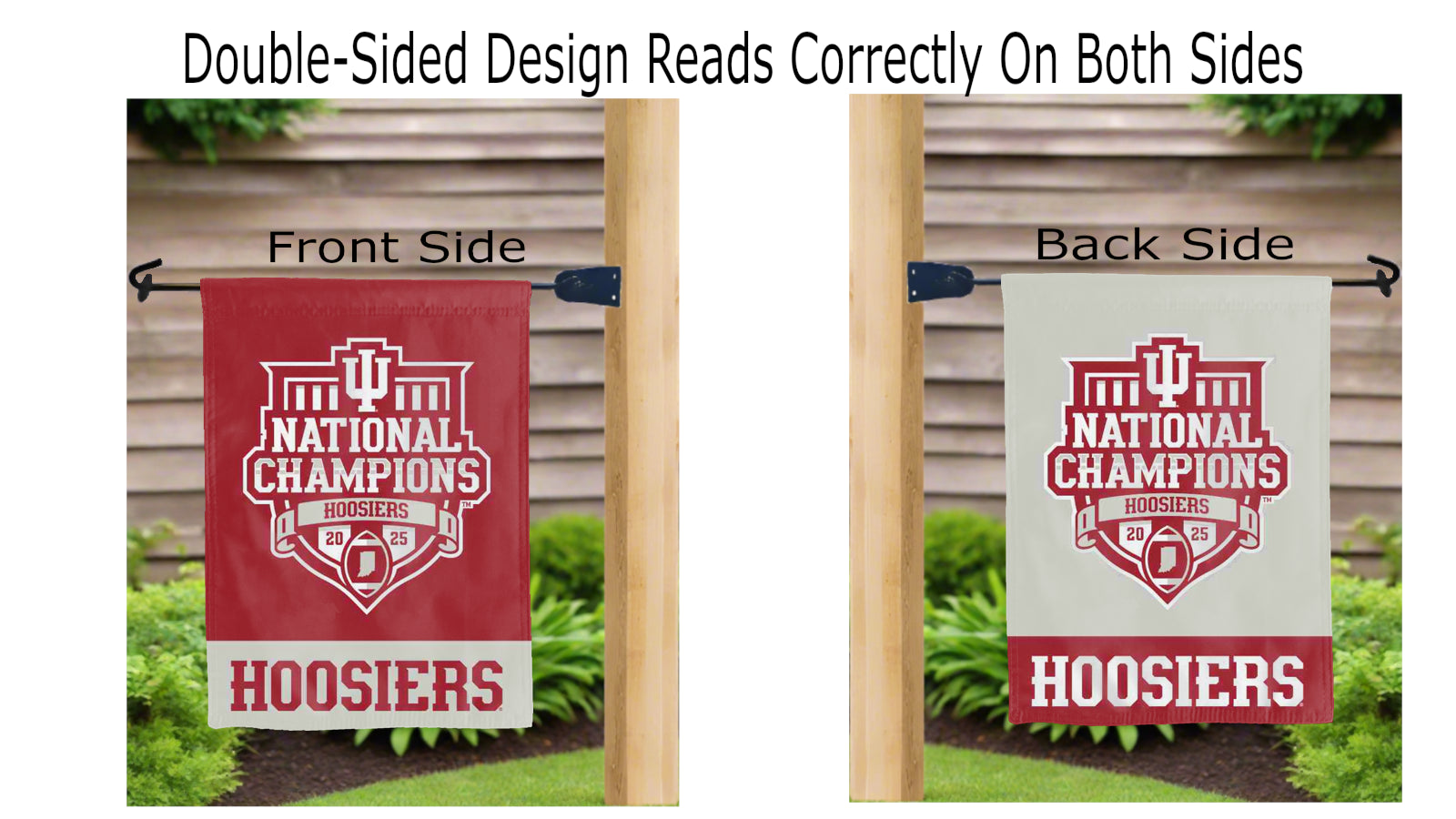 indiana college football champions 2025 logo reading correctly on both sides of red and grey double sided garden flag