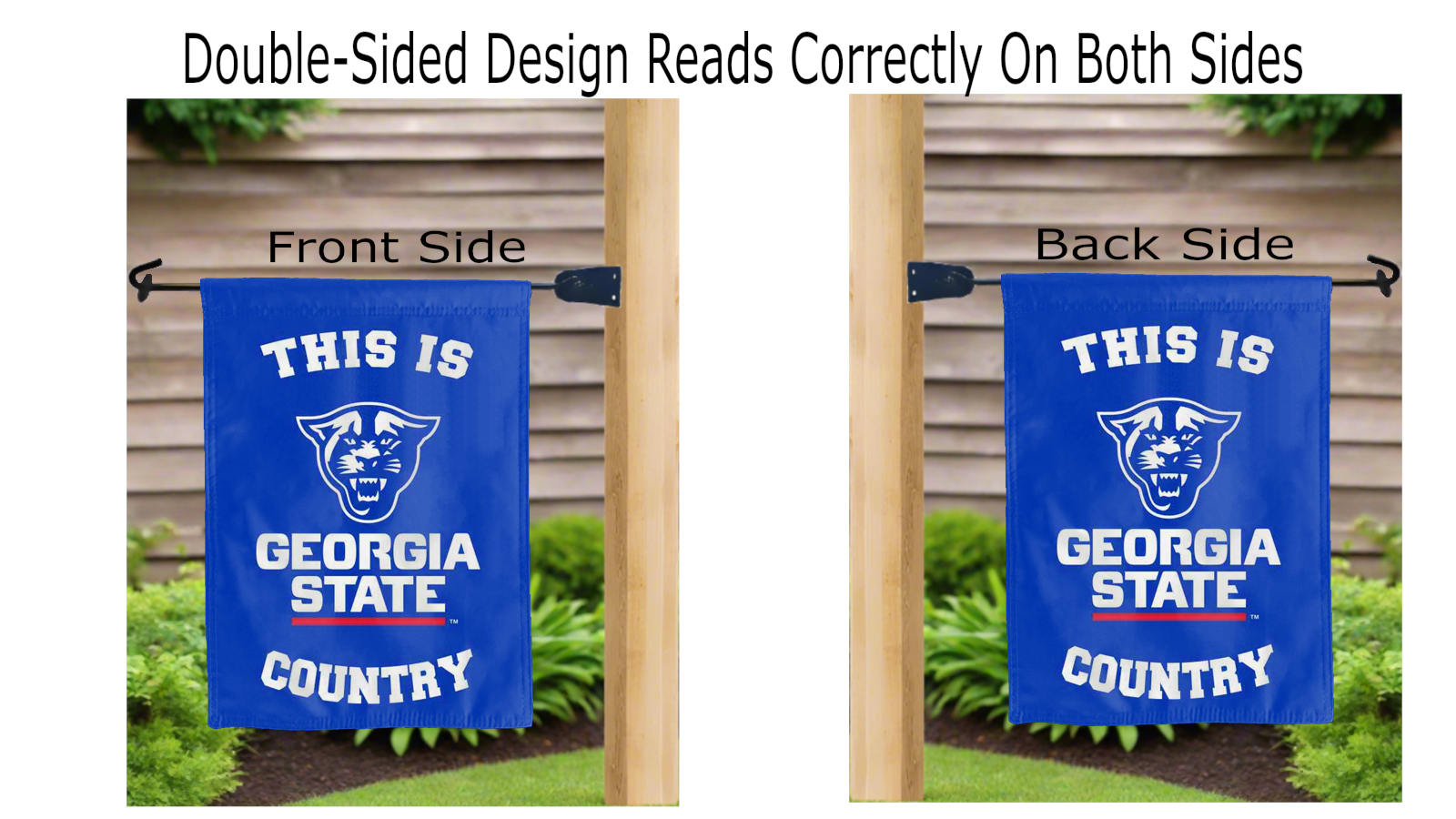 this is Georgia State Country logo reading correctly on both sides of double sided garden flag