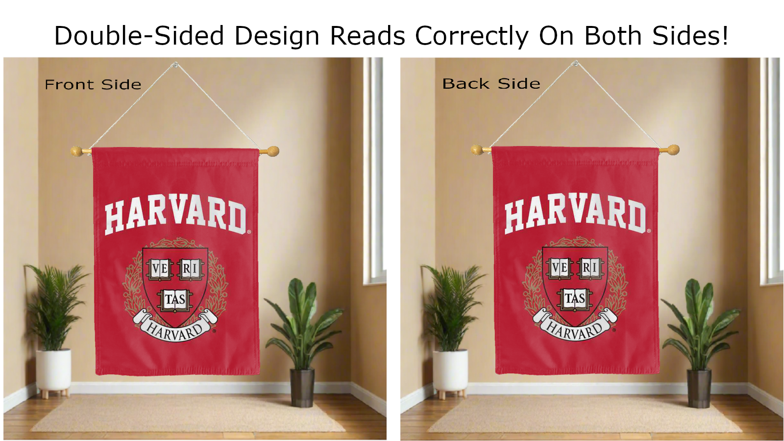 harvard shield logo reading correctly on both sides of red double sided house flag