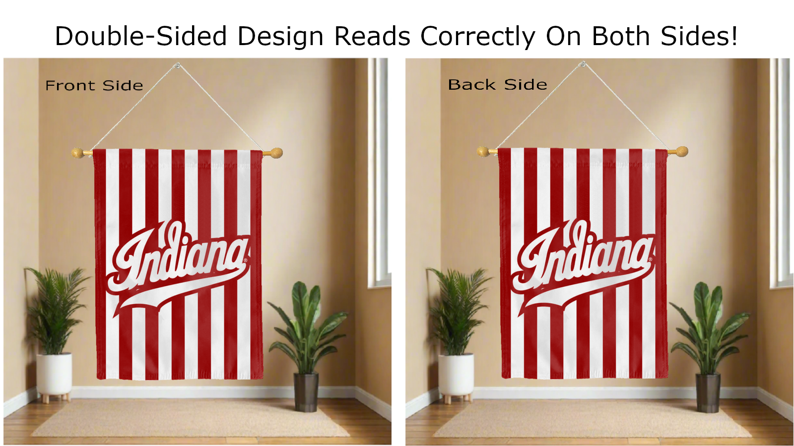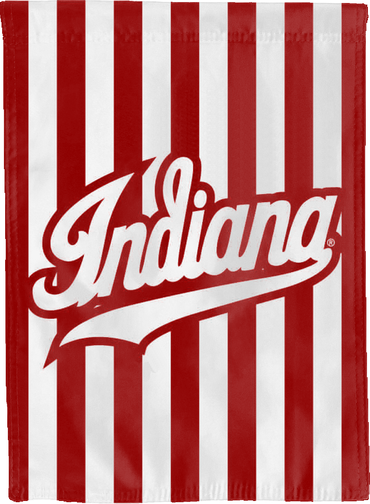 Break the monotonous look of your room with this Officially Licensed Indiana University House Flag with Candy Stripes Background and Indiana University Logo! Measuring 30" x 40", this house flag is the product of two screen-printed flags sewn together with a middle liner sewn in between the two flags to stop the see-through and allow the Indiana University logo to read correctly on both sides. The sleeve across the top also makes it easy to insert the flag into a flagpole or flag hanger if you choose to hang it outside your home. Regardless of where you choose to hang it, this Indiana Candy Stripe House Flag is sure to reflect your school pride any day of the week.