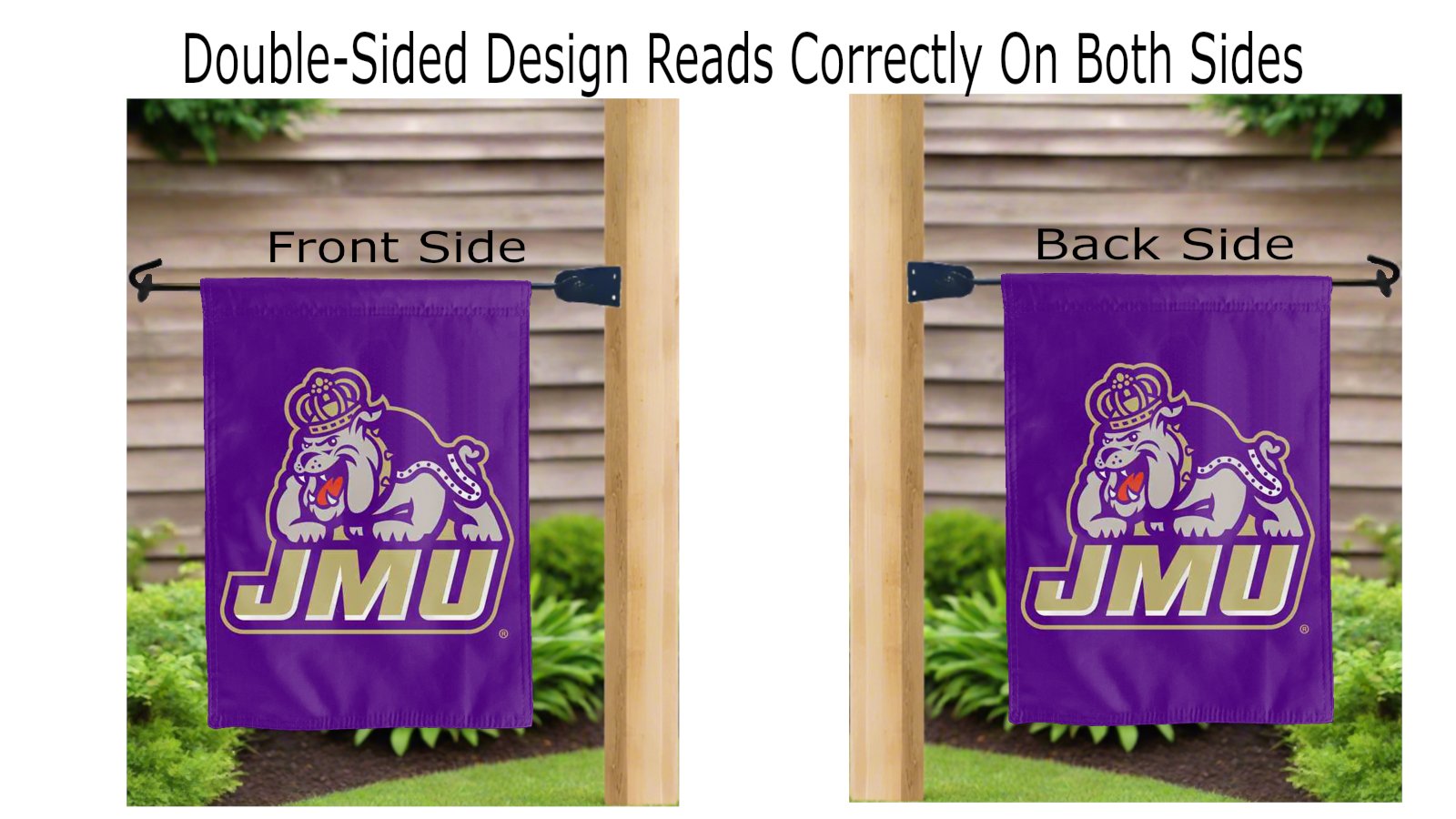 jmu logo reading correctly on both sides of purple garden flag
