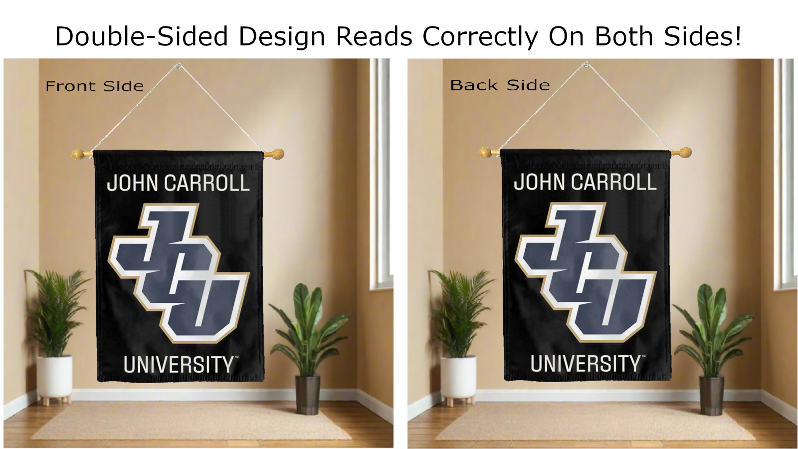 Break the monotonous look of your room with this Officially Licensed John Carroll University Double Sided House Flag! Measuring 30" x 40", this house flag is the product of two screen-printed flags sewn together with a middle liner sewn in between the two flags to stop the see-through and allow the logo to read correctly on both sides. The sleeve across the top also makes it easy to insert the flag into a flagpole or flag hanger if you choose to hang it outside your home. Regardless of where you choose to hang it, this John Carroll University Double Sided House Flag is sure to reflect your school pride any day of the week.