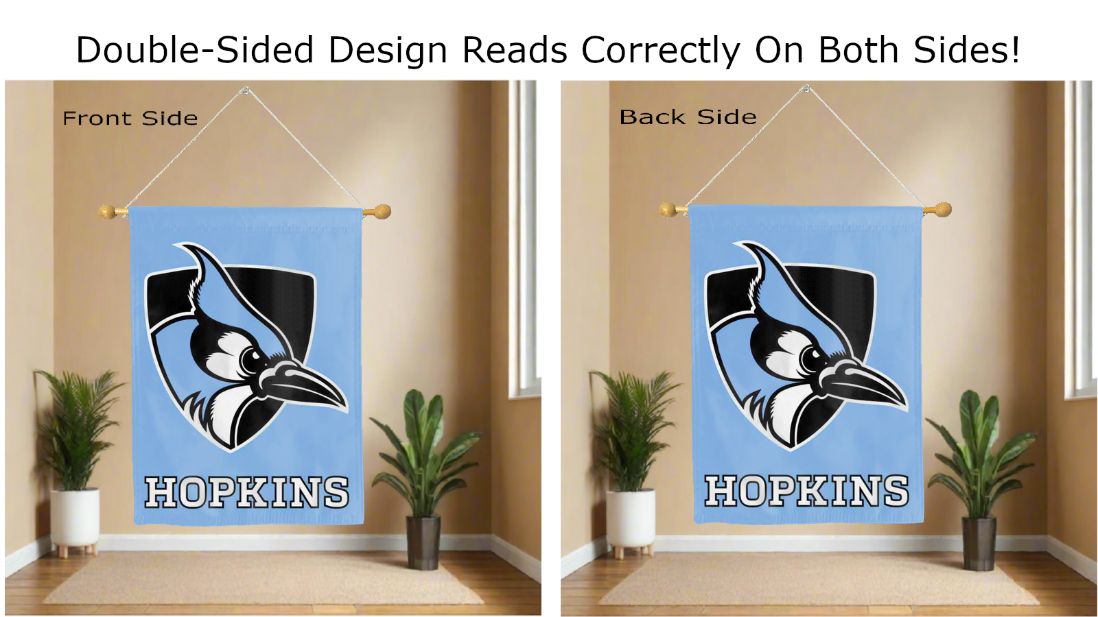 Break the monotonous look of your room with this Officially Licensed Johns Hopkins Double Sided House Flag! Measuring 30" x 40", this house flag is the product of two screen-printed flags sewn together with a middle liner sewn in between the two flags to stop the see-through and allow the logo to read correctly on both sides. The sleeve across the top also makes it easy to insert the flag into a flagpole or flag hanger if you choose to hang it outside your home. Regardless of where you choose to hang it, this Johns Hopkins Double Sided House Flag is sure to reflect your school pride any day of the week.