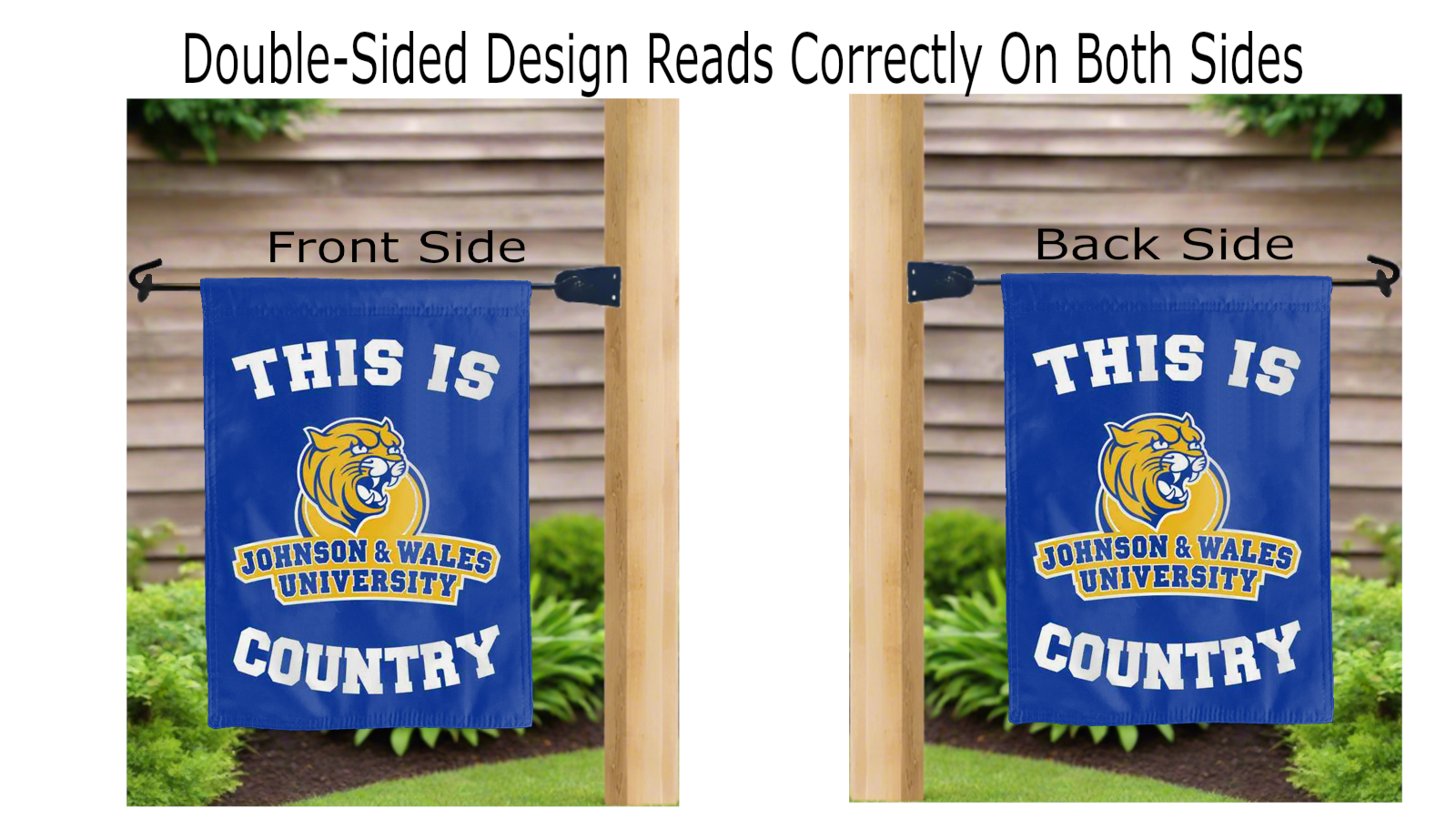 this is johnson & wales university wildcats country logo reading correctly on both sides of blue double sided garden flag