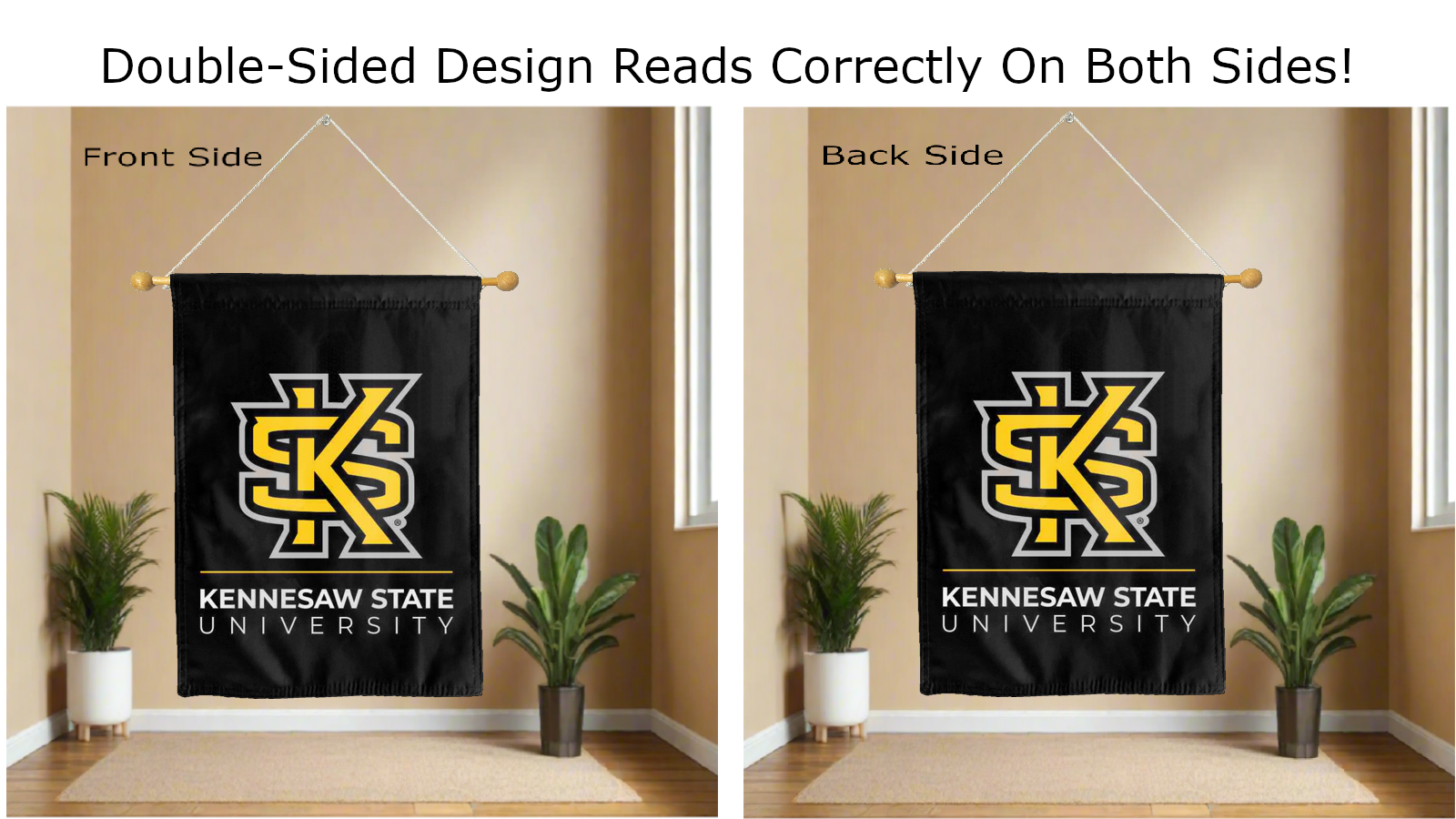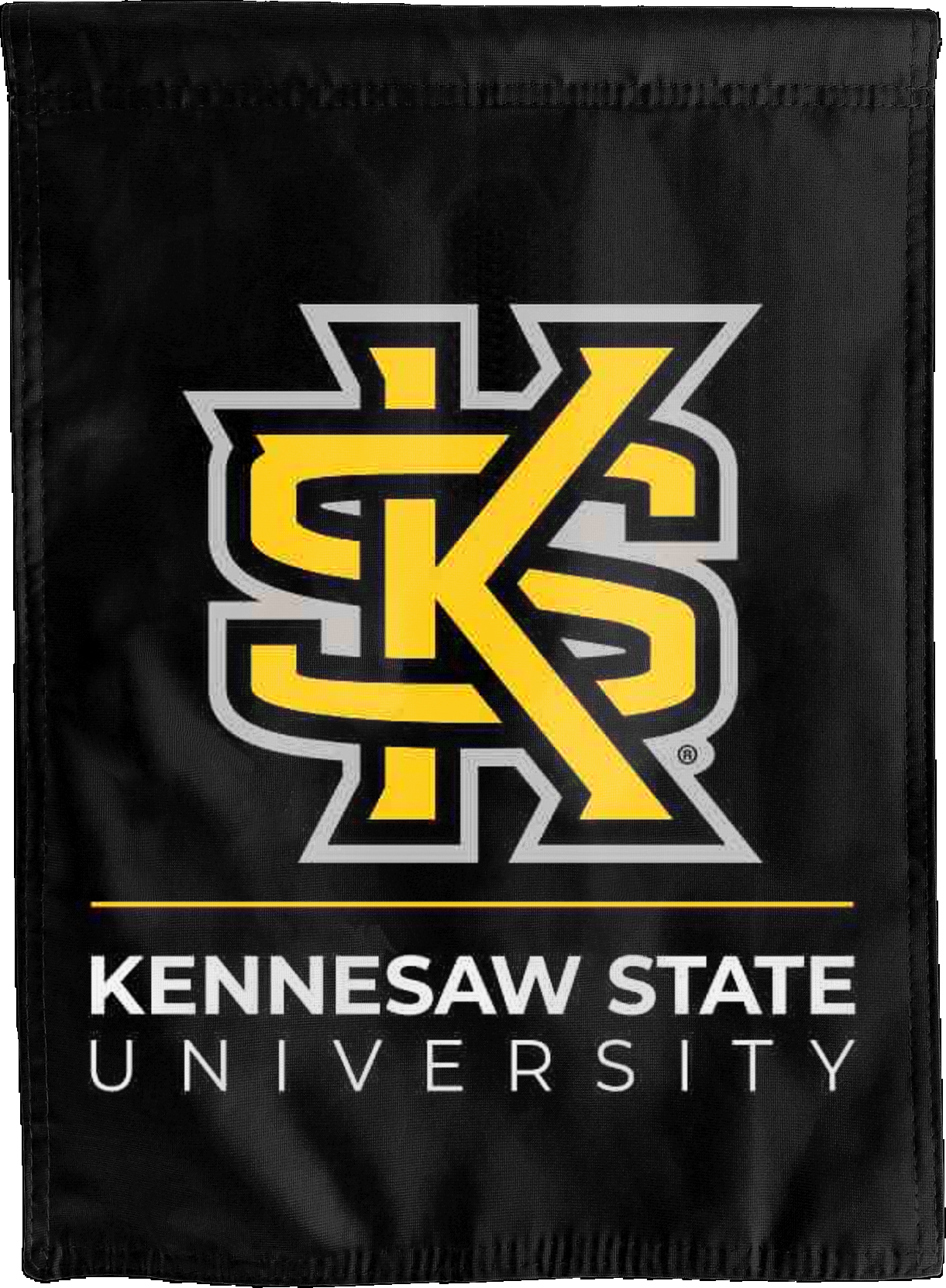 Break the monotonous look of your room with this Officially Licensed Kennesaw State University House Flag! Measuring 30" x 40", this house flag is the product of two screen-printed flags sewn together with a middle liner sewn in between the two flags to stop the see-through and allow the logo to read correctly on both sides. The sleeve across the top also makes it easy to insert the flag into a flagpole or flag hanger if you choose to hang it outside your home. Regardless of where you choose to hang it, this Kennesaw State House Flag is sure to reflect your school pride any day of the week.