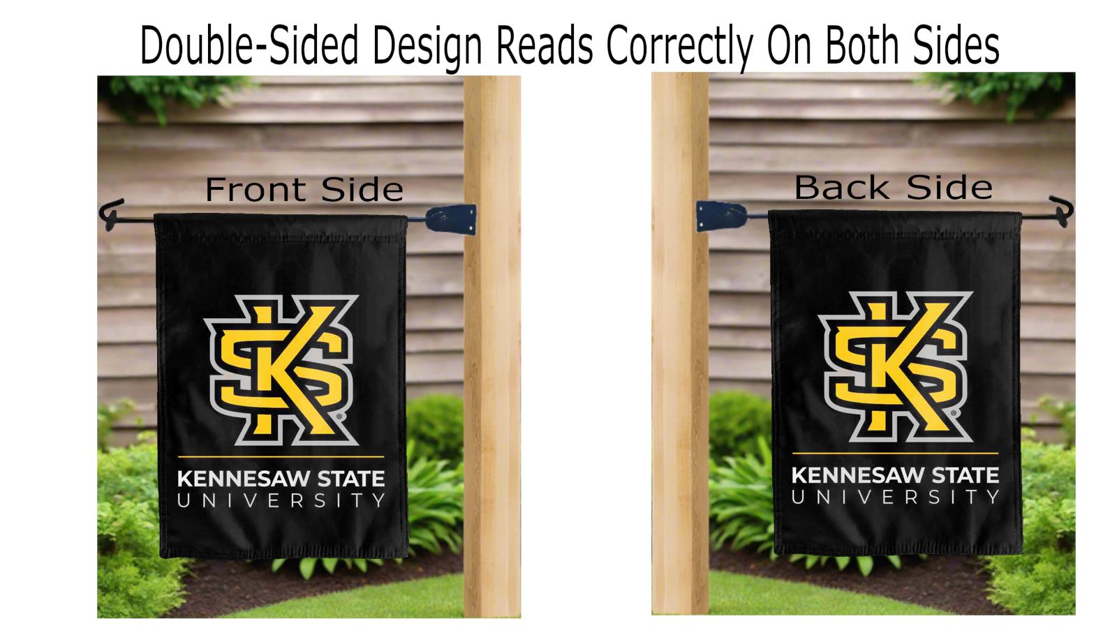 kennesaw state university logo reading correctly on both sides of black double sided garden flag