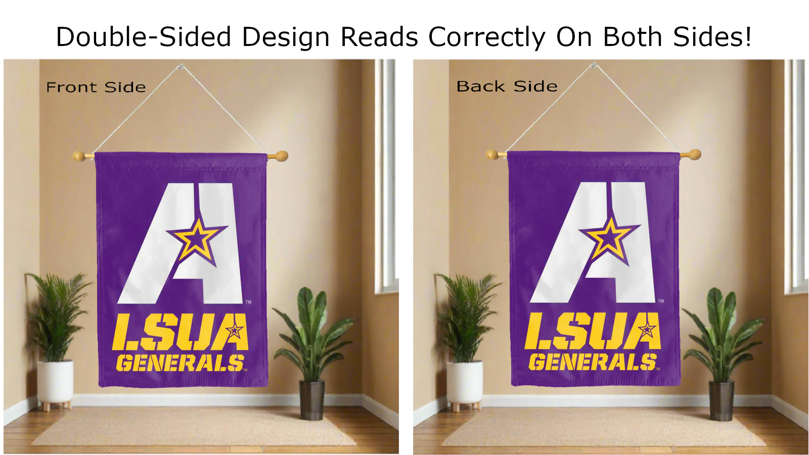 lsua generals logo reading correctly on both sides of purple house flag
