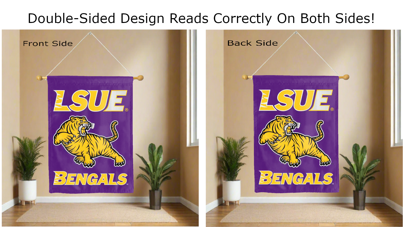 Break the monotonous look of your room with this Officially Licensed LSU Eunice House Flag! Measuring 30" x 40", this house flag is the product of two screen-printed flags sewn together with a middle liner sewn in between the two flags to stop the see-through and allow the logo to read correctly on both sides. The sleeve across the top also makes it easy to insert the flag into a flagpole or flag hanger if you choose to hang it outside your home. Regardless of where you choose to hang it, this LSU Eunice House Flag is sure to reflect your school pride any day of the week.