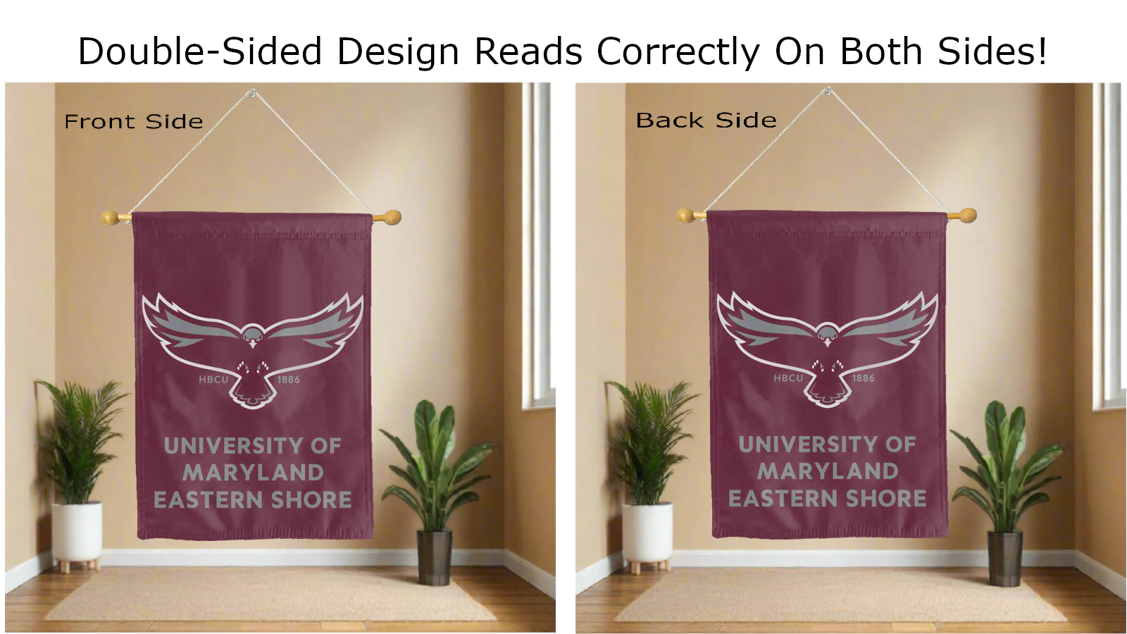 Break the monotonous look of your room with this Officially Licensed University of Maryland Eastern Shore Double Sided House Flag! Measuring 30" x 40", this house flag is the product of two screen-printed flags sewn together with a middle liner sewn in between the two flags to stop the see-through and allow the logo to read correctly on both sides. The sleeve across the top also makes it easy to insert the flag into a flagpole or flag hanger if you choose to hang it outside your home. Regardless of where you choose to hang it, this University of Maryland Eastern Shore Double Sided House Flag is sure to reflect your school pride any day of the week.