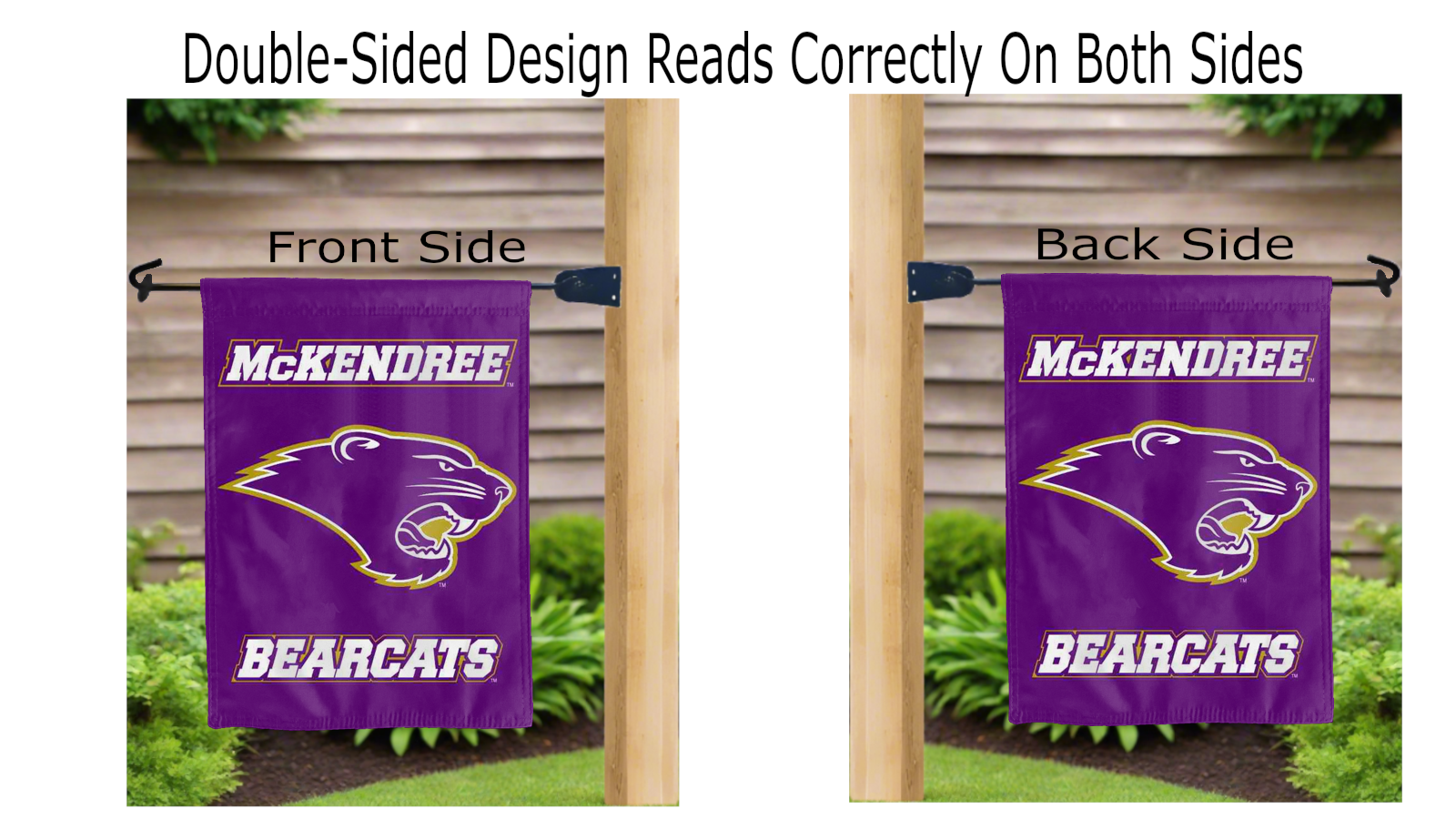 mckendree bearcats logo reading correctly on both sides of purple double sided garden flag