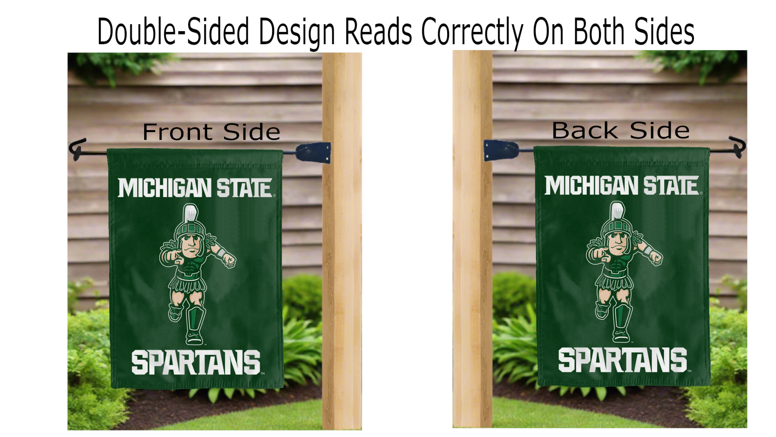 Let your voice scream “Go Spartans!” with this NCAA Officially Licensed, 13x18 Michigan State Garden Flag with Sparty Mascot and Spartans Logo! Made of 2-ply polyester, this flag is the result of two flags being screen printed and sewn together with a middle liner sewn in between them to stop the see-through, allowing the Sparty Mascot and Spartans logo to look clear and read correctly on both sides. The sleeve across the top makes it easy for you to insert the flag into your garden flag stand. No matter where you are, this Michigan State garden flag is sure to make it clear your loyalty lies with the Spartans on game day.