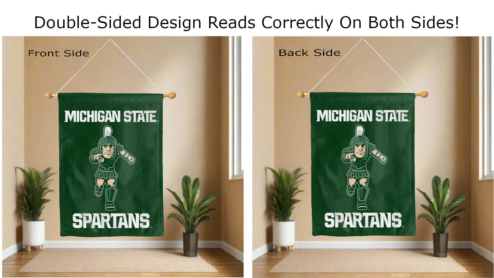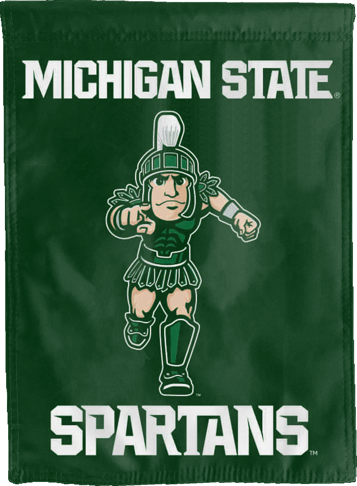 Break the monotonous look of your room with this Officially Licensed Michigan State House Flag with Sparty Mascot and Spartans Logo! Measuring 30" x 40", this house flag is the product of two screen-printed flags sewn together with a middle liner sewn in between the two flags to stop the see-through and allow the Sparty Mascot and Spartans logo to read correctly on both sides. The sleeve across the top also makes it easy to insert the flag into a flagpole or flag hanger if you choose to hang it outside your home. Regardless of where you choose to hang it, this Michigan State House Flag is sure to reflect your school pride any day of the week.
