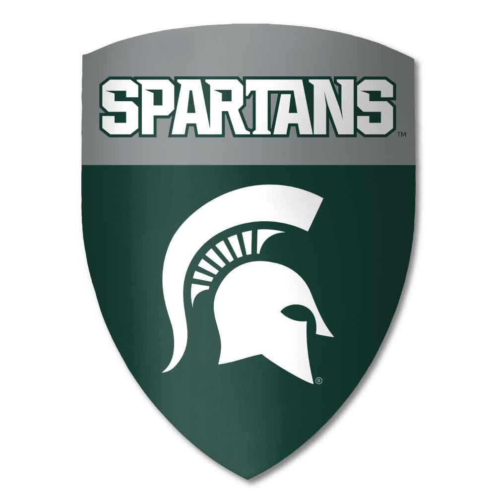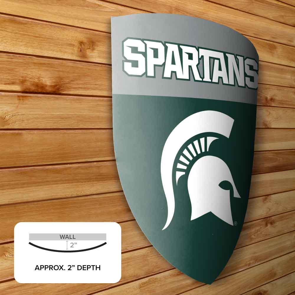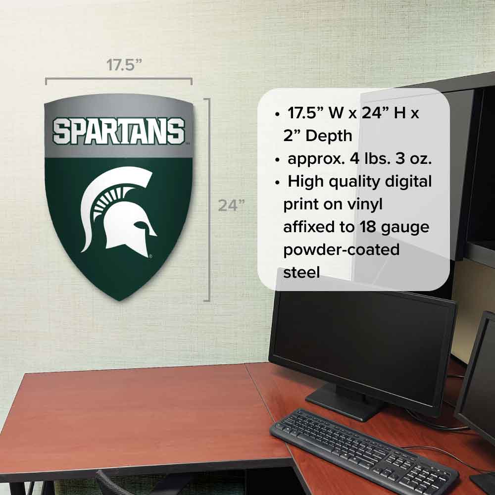 Decorate your home with this Officially Licensed, 17.5" x 24" Michigan State University Spartans Medieval Shield!! Printed right here in the U.S.A., this medieval shield includes a steel chain on the back side, making it both easy and secure to hang. The university logo is digitally printed onto this metal shield, making it the perfect choice for you Michigan State Spartans Fans looking to showcase your school pride while at the same time giving your home decor that Michigan State Spartan flair it deserves.