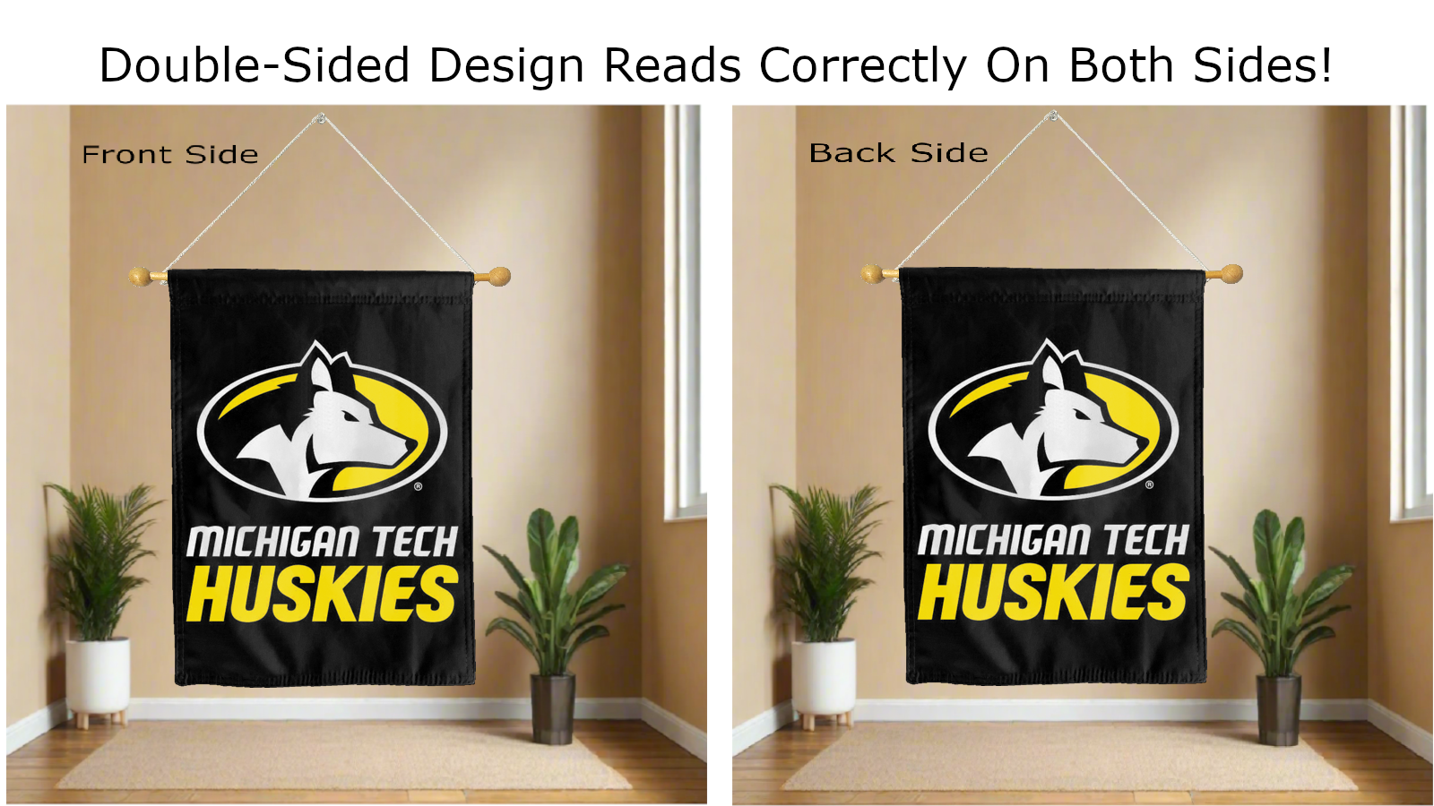 Break the monotonous look of your room with this Officially Licensed Michigan Tech Huskies House Flag! Measuring 30" x 40", this house flag is the product of two screen-printed flags sewn together with a middle liner sewn in between the two flags to stop the see-through and allow the logo to read correctly on both sides. The sleeve across the top also makes it easy to insert the flag into a flagpole or flag hanger if you choose to hang it outside your home. Regardless of where you choose to hang it, this Michigan Tech House Flag is sure to reflect your school pride any day of the week.