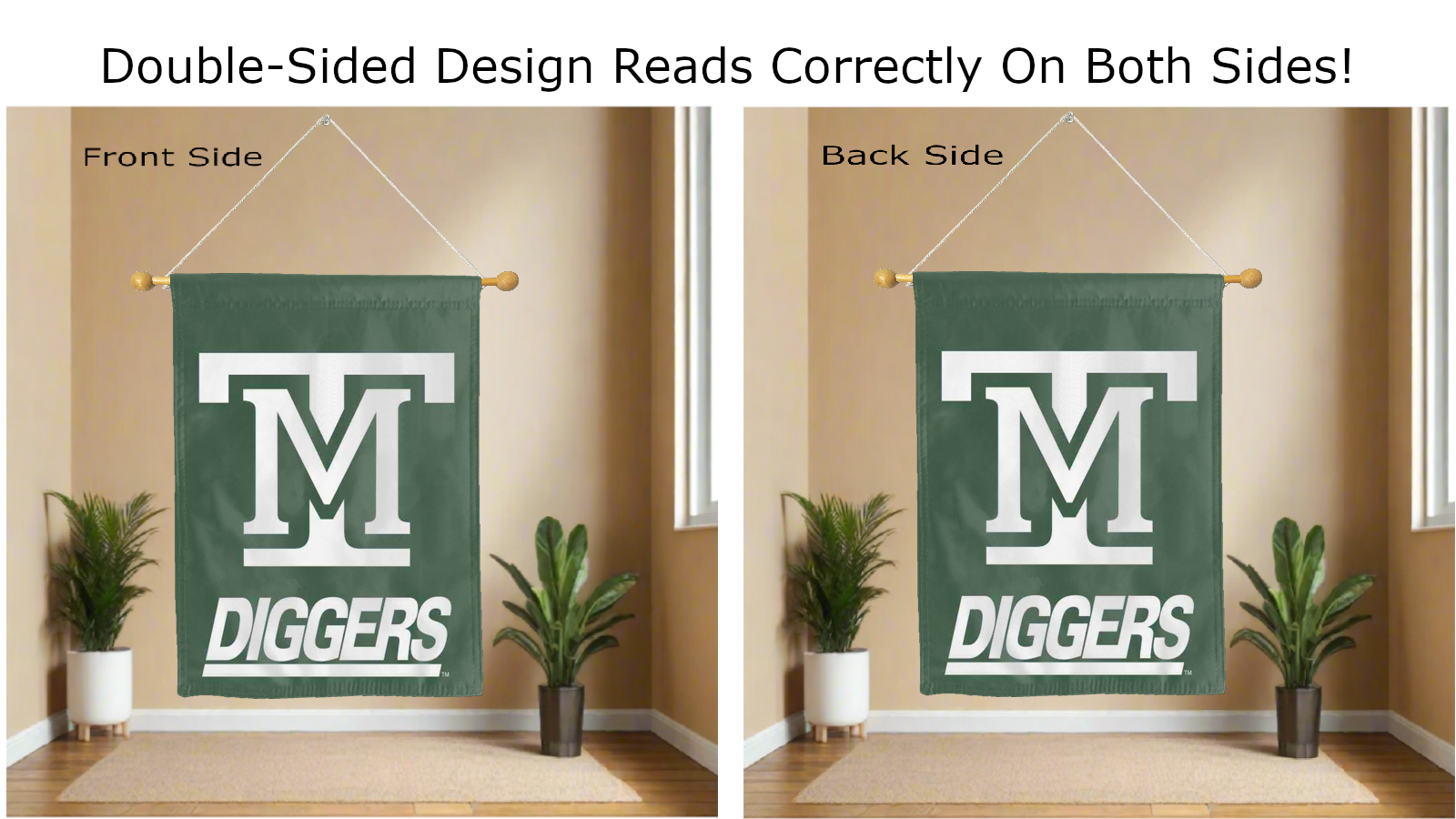 Break the monotonous look of your room with this Officially Licensed Montana Tech Double Sided House Flag! Measuring 30" x 40", this house flag is the product of two screen-printed flags sewn together with a middle liner sewn in between the two flags to stop the see-through and allow the logo to read correctly on both sides. The sleeve across the top also makes it easy to insert the flag into a flagpole or flag hanger if you choose to hang it outside your home. Regardless of where you choose to hang it, this Montana Tech Double Sided House Flag is sure to reflect your school pride any day of the week.