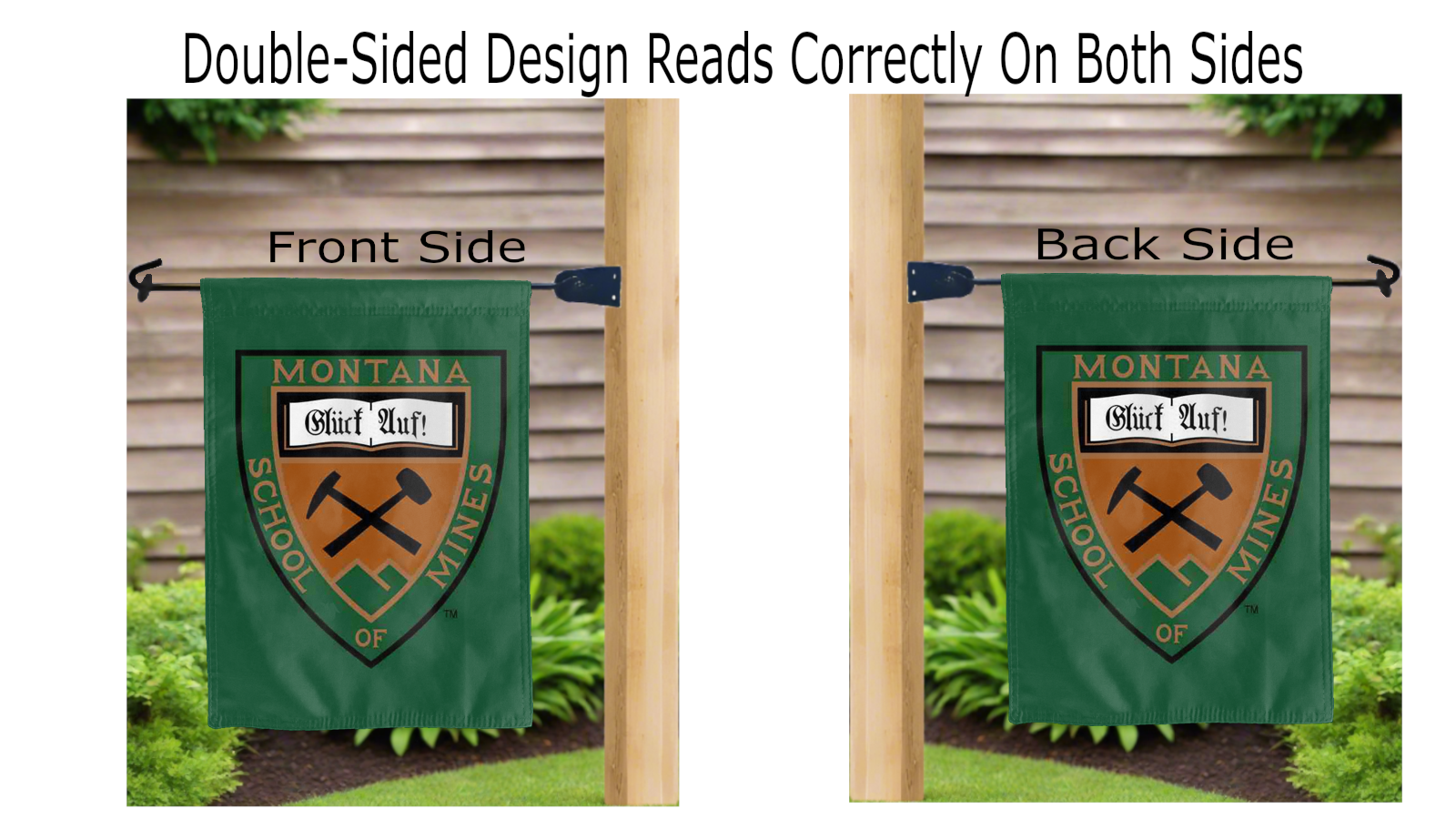 montana school of mines logo reading correctly on both sides of green double sided garden flag