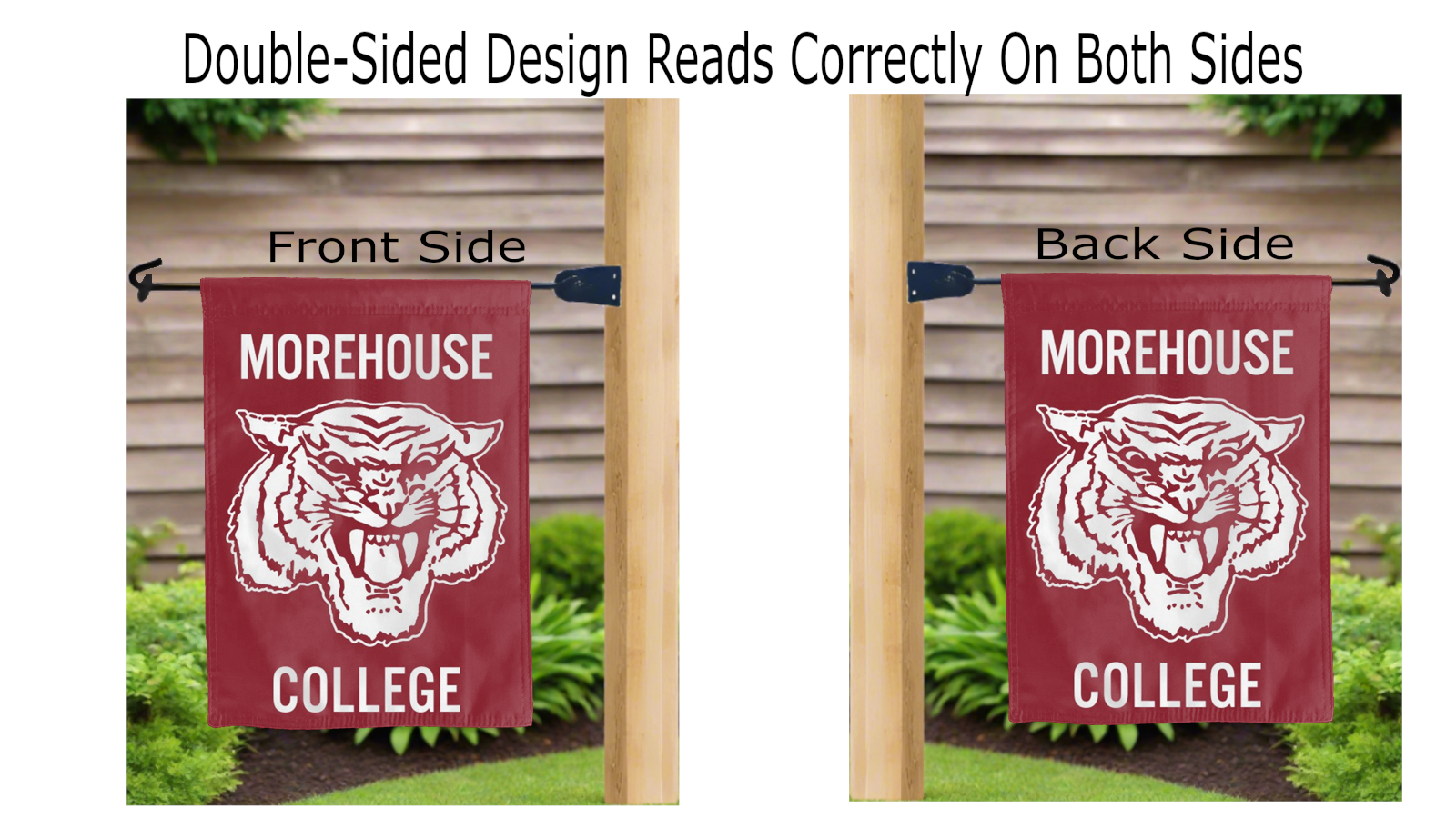 morehouse college maroon tiger logo reading correctly on both sides of maroon double sided garden flag