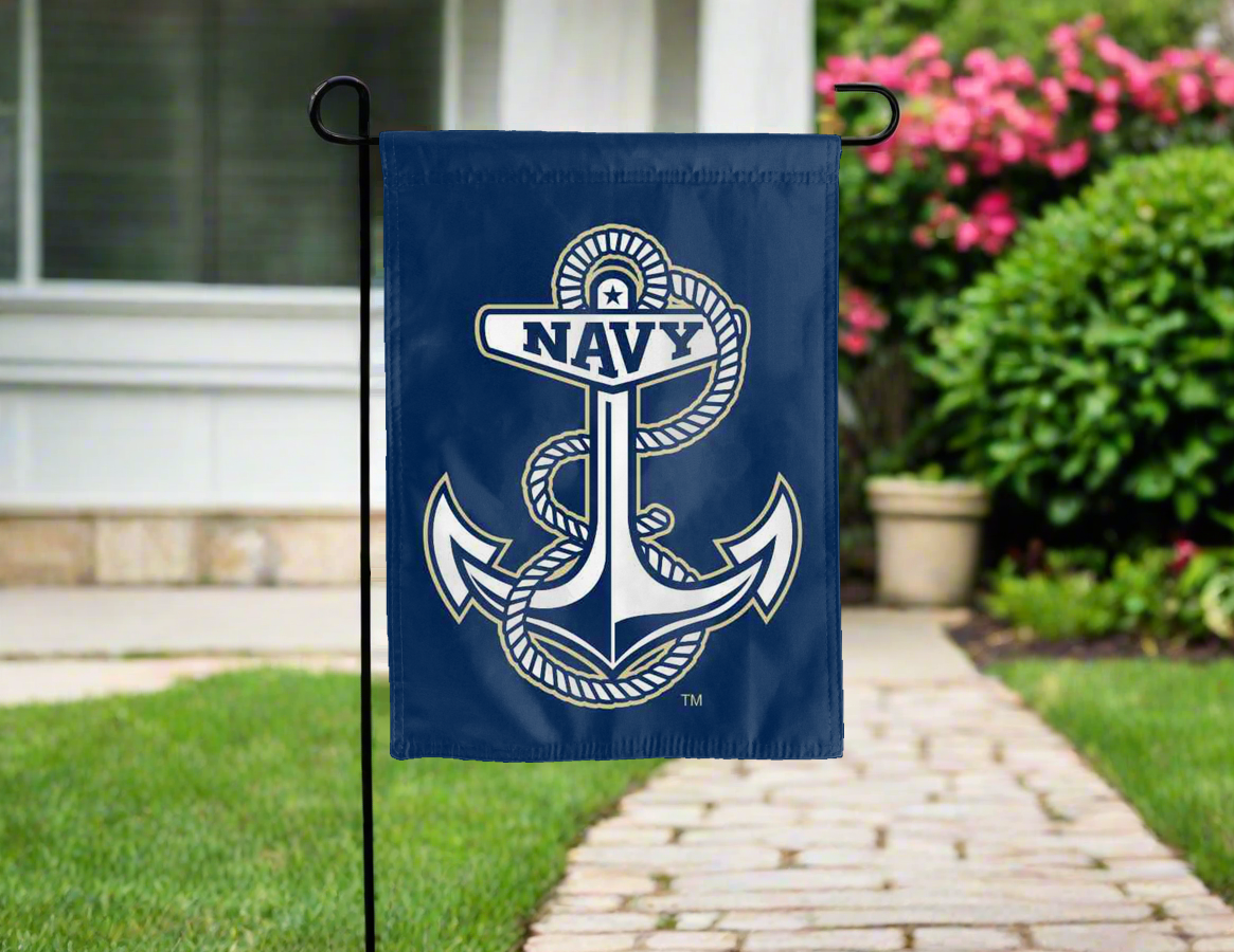 • Load image into Gallery viewer, garden flag with Naval Academy anchor logo hung for yard decor