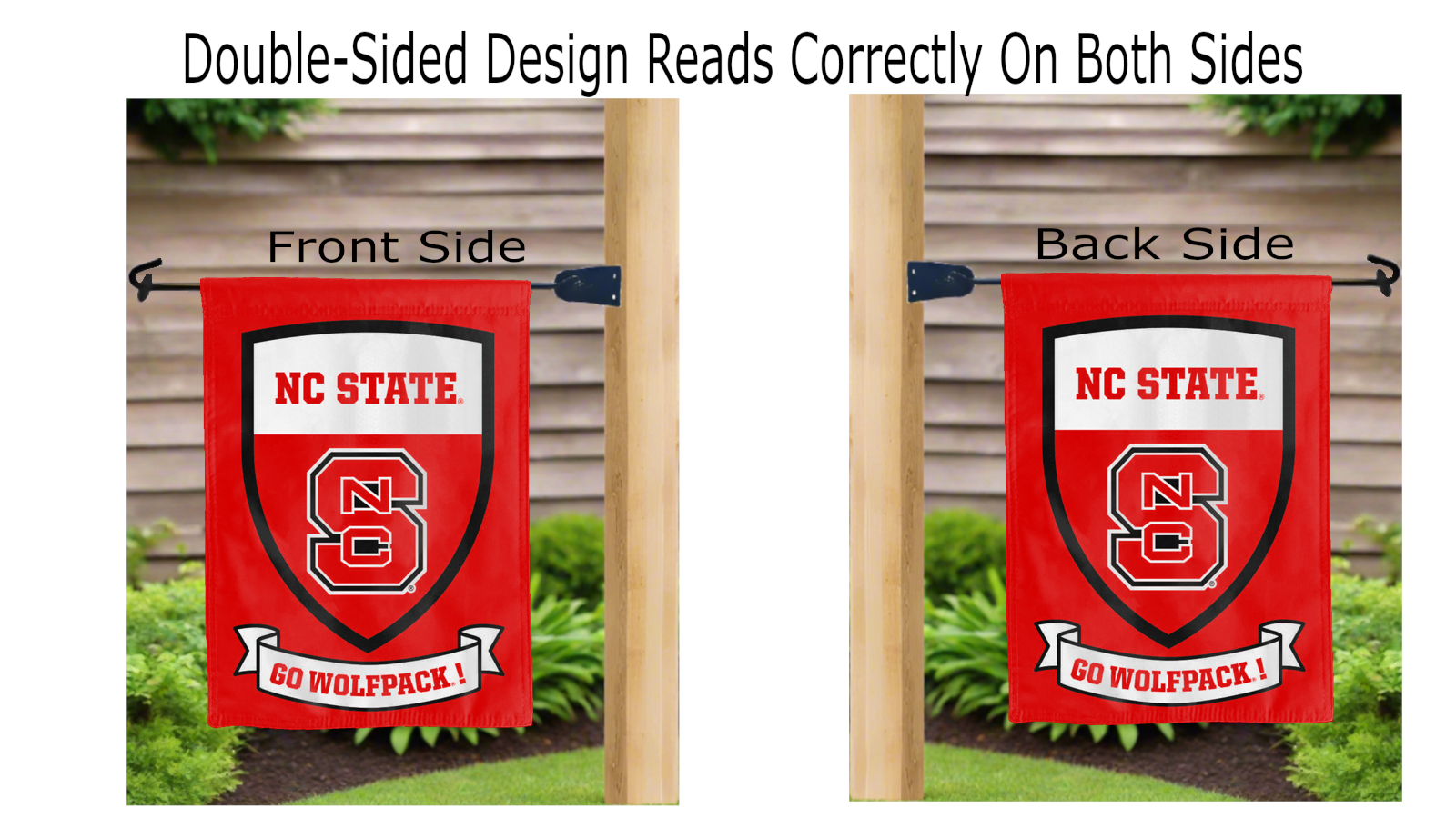 nc state shield and go wolfpack logo reading correctly on both sides of garden flag