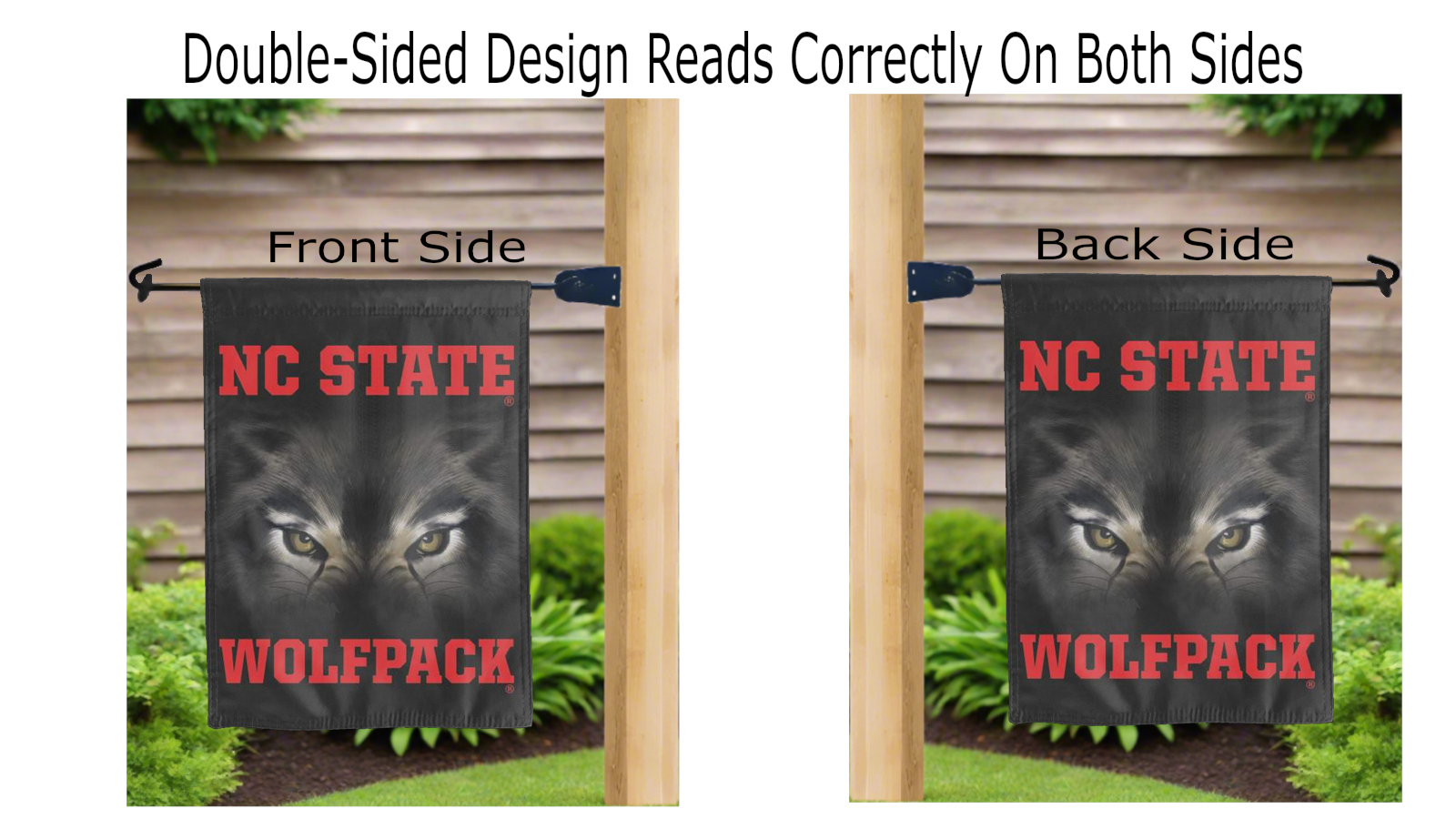 nc state wolfpack realistic wolf eyes logo reading correctly on both sides of ncsu garden flag