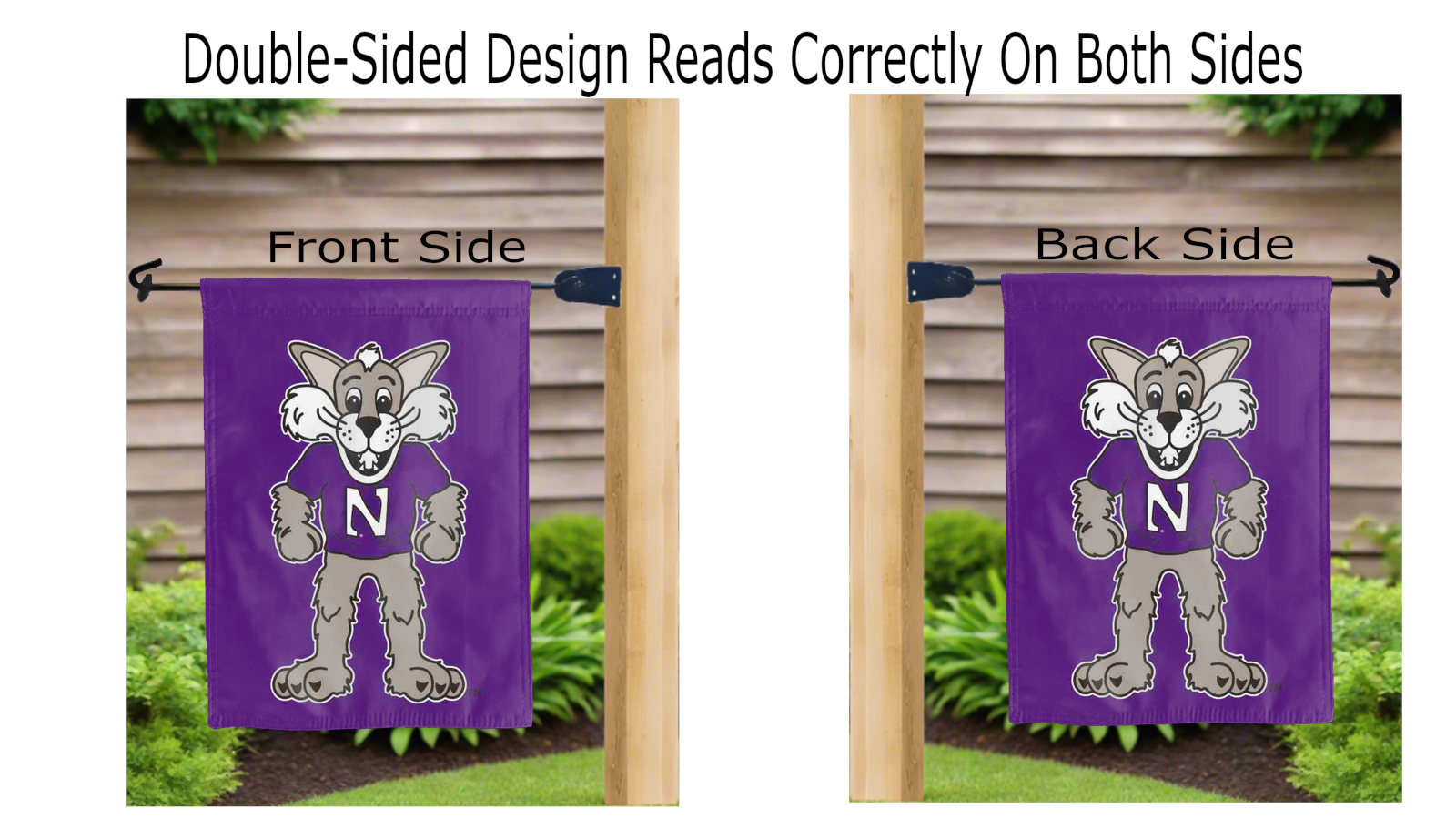 willie the wildcat logo reading correctly on both sides of northwestern university garden flag