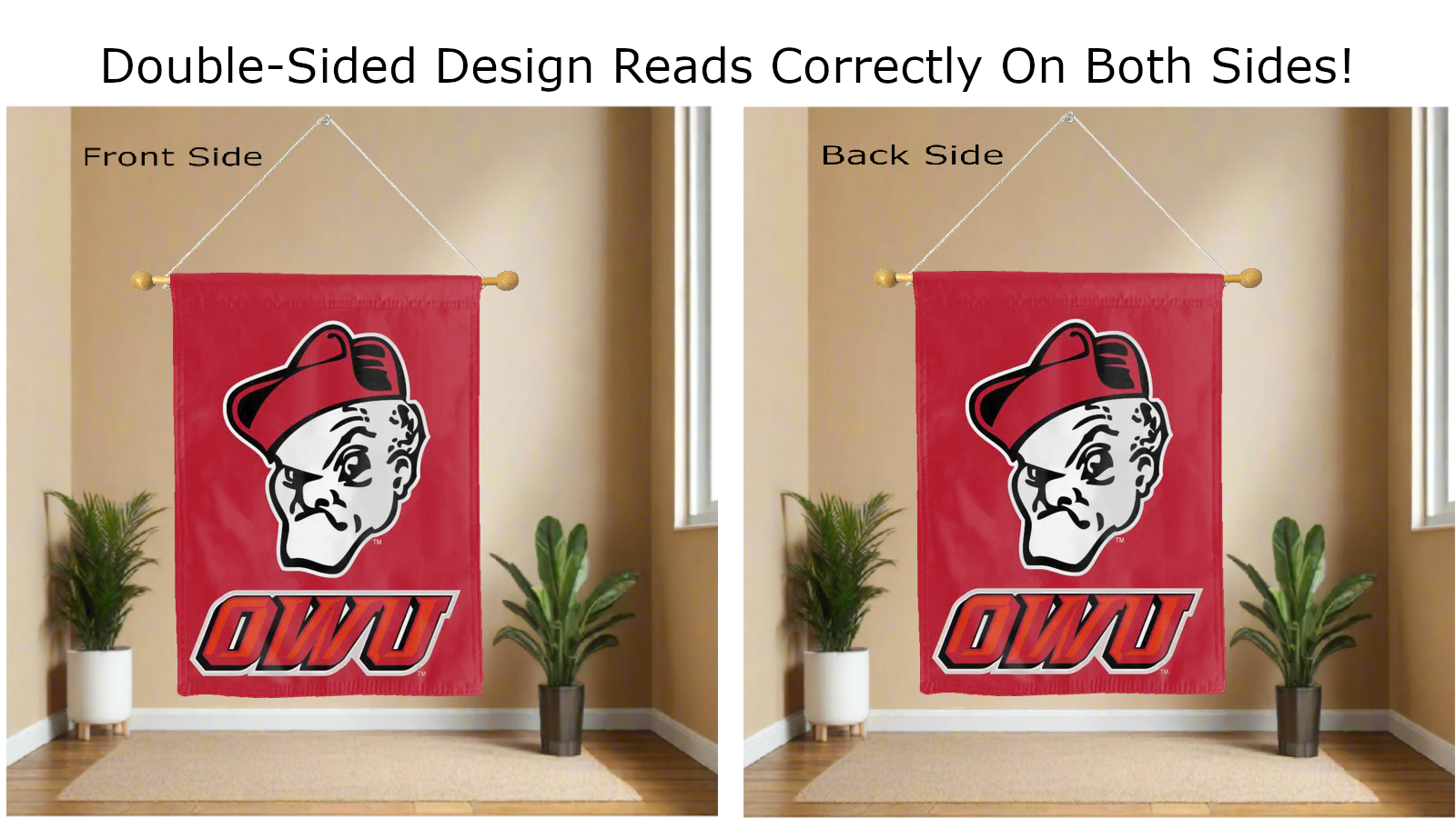 Break the monotonous look of your room with this Officially Licensed Ohio Wesleyan Double Sided House Flag! Measuring 30" x 40", this house flag is the product of two screen-printed flags sewn together with a middle liner sewn in between the two flags to stop the see-through and allow the logo to read correctly on both sides. The sleeve across the top also makes it easy to insert the flag into a flagpole or flag hanger if you choose to hang it outside your home. Regardless of where you choose to hang it, this Ohio Wesleyan Double Sided House Flag is sure to reflect your school pride any day of the week.