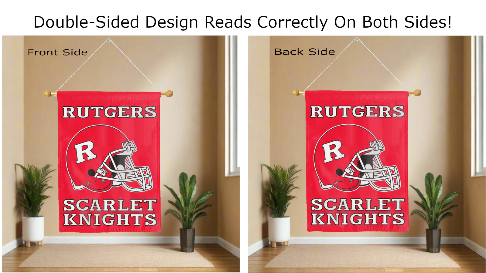 Break the monotonous look of your room with this Officially Licensed Rutgers University Football Double Sided House Flag! Measuring 30" x 40", this house flag is the product of two screen-printed flags sewn together with a middle liner sewn in between the two flags to stop the see-through and allow the logo to read correctly on both sides. The sleeve across the top also makes it easy to insert the flag into a flagpole or flag hanger if you choose to hang it outside your home. Regardless of where you choose to hang it, this Rutgers University Football Double Sided House Flag is sure to reflect your school pride any day of the week.