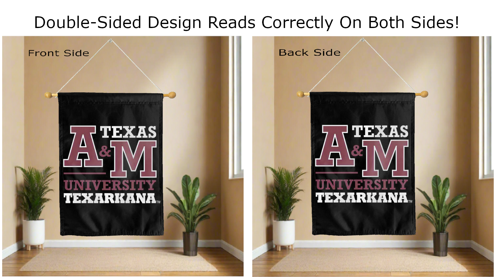 Break the monotonous look of your room with this Officially Licensed Texas A&M University-Texarkana Double Sided House Flag! Measuring 30" x 40", this house flag is the product of two screen-printed flags sewn together with a middle liner sewn in between the two flags to stop the see-through and allow the logo to read correctly on both sides. The sleeve across the top also makes it easy to insert the flag into a flagpole or flag hanger if you choose to hang it outside your home. Regardless of where you choose to hang it, this Texas A&M University-Texarkana Double Sided House Flag is sure to reflect your school pride any day of the week.