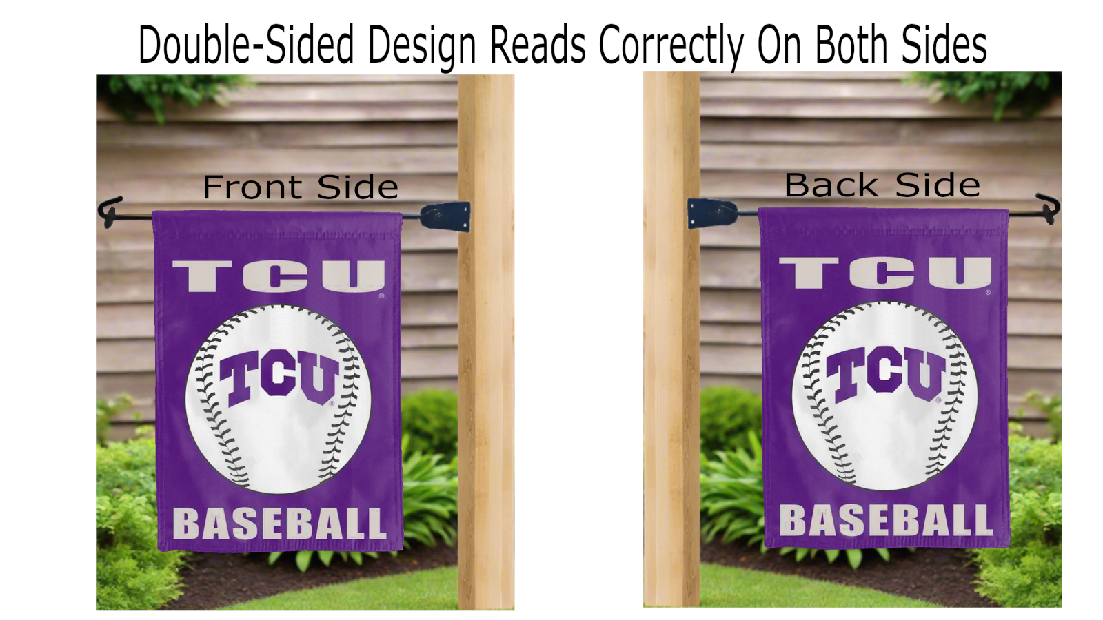 Let your voice scream "Go Horned Frogs!" with this NCAA Officially Licensed, blue 13" x 18" Texas Christian University (TCU) Baseball Garden flag! Made of 2-ply polyester, this flag is the result of two dye-sublimated flags sewn together with a middle liner sewn in between them to stop the see-through, allowing the logo to look clear and read correctly on both sides. The sleeve across the top makes it easy for you to insert the flag into your garden flag stand. No matter where you are, this garden flag is sure to make it clear your loyalty lies with the Texas Christian University (TCU) Horned Frogs on game day.
