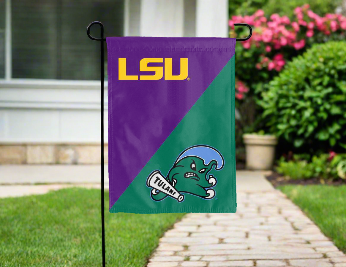 Show your support for both the LSU Tigers and Tulane University Green Wave House Divided Garden Flag with this Officially Licensed, 13" x 18" LSU Tulane University House Divided Garden Flag!! Made of polyester, this flag is the ultimate result of two screen-printed flags sewn together to create this house divided garden flag. A middle liner is sewn in between the two flags to stop the see-through, allowing the logos to look clear and read correctly on both sides. The sleeve across the top makes it easy for you to insert the flag into your garden flag stand. No matter what day of the week, this garden flag is sure to make it clear your loyalty lies with both teams on game day.