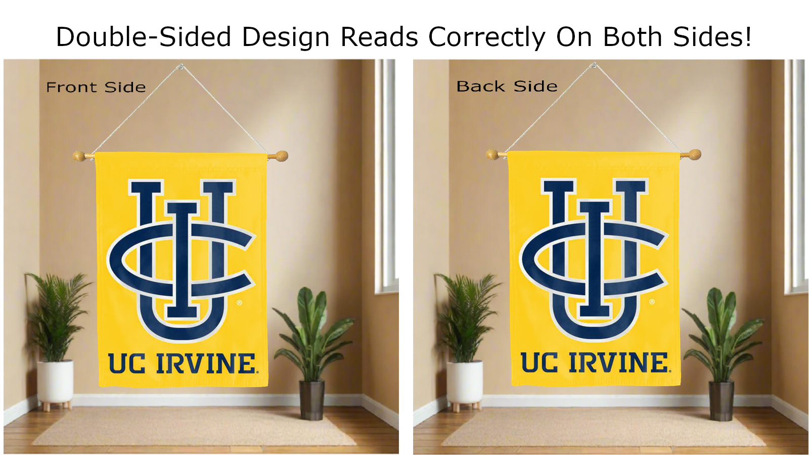 Break the monotonous look of your room with this Officially Licensed UC Irvine Double Sided House Flag! Measuring 30" x 40", this house flag is the product of two screen-printed flags sewn together with a middle liner sewn in between the two flags to stop the see-through and allow the logo to read correctly on both sides. The sleeve across the top also makes it easy to insert the flag into a flagpole or flag hanger if you choose to hang it outside your home. Regardless of where you choose to hang it, this UC Irvine Double Sided House Flag is sure to reflect your school pride any day of the week.