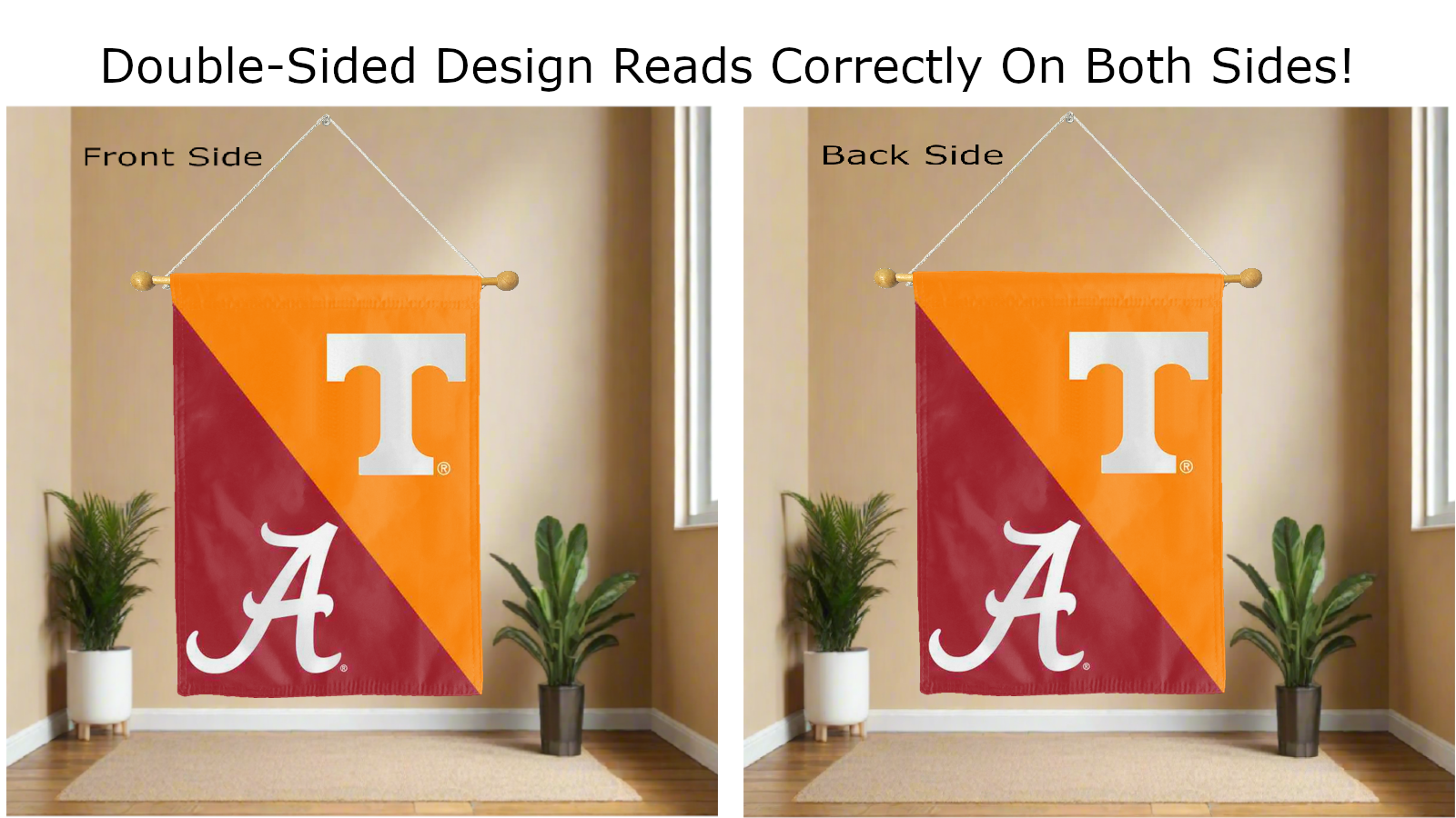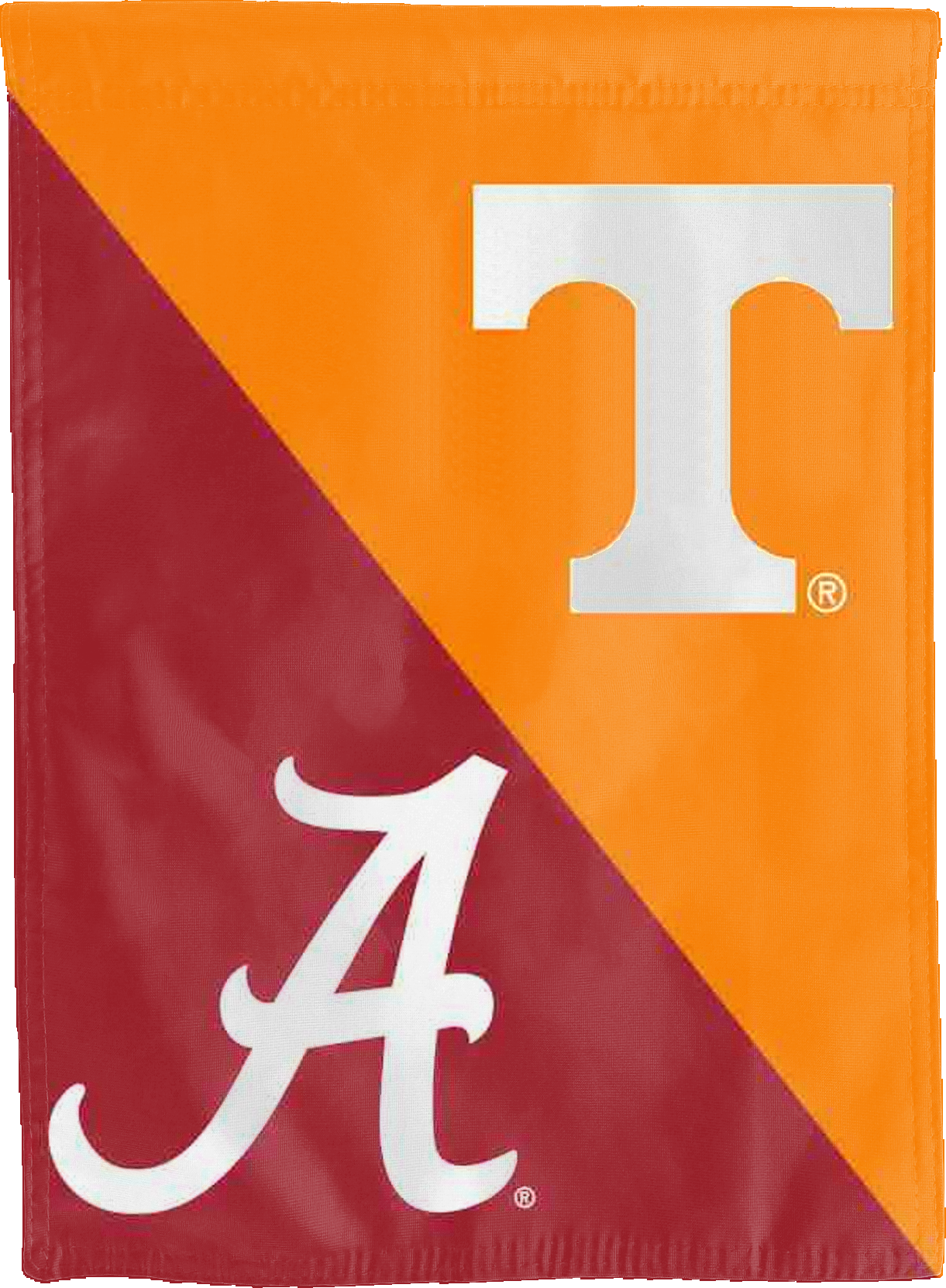 What better way to spice up a plain room than with this Officially Licensed Tennessee Alabama Double Sided House Divided House Flag! Measuring 30" x 40", this house flag is the product of two screen-printed flags sewn together with a middle liner sewn in between the two flags to stop the see through and allow the logos to read correctly on both sides. The sleeve across the top also makes it easy to insert into the flagpole or flag hanger if you choose to hang it outside your home. Regardless of where you decide to hang it, this house divided double sided House Flag is sure to reflect your appreciation for both teams any day of the week.