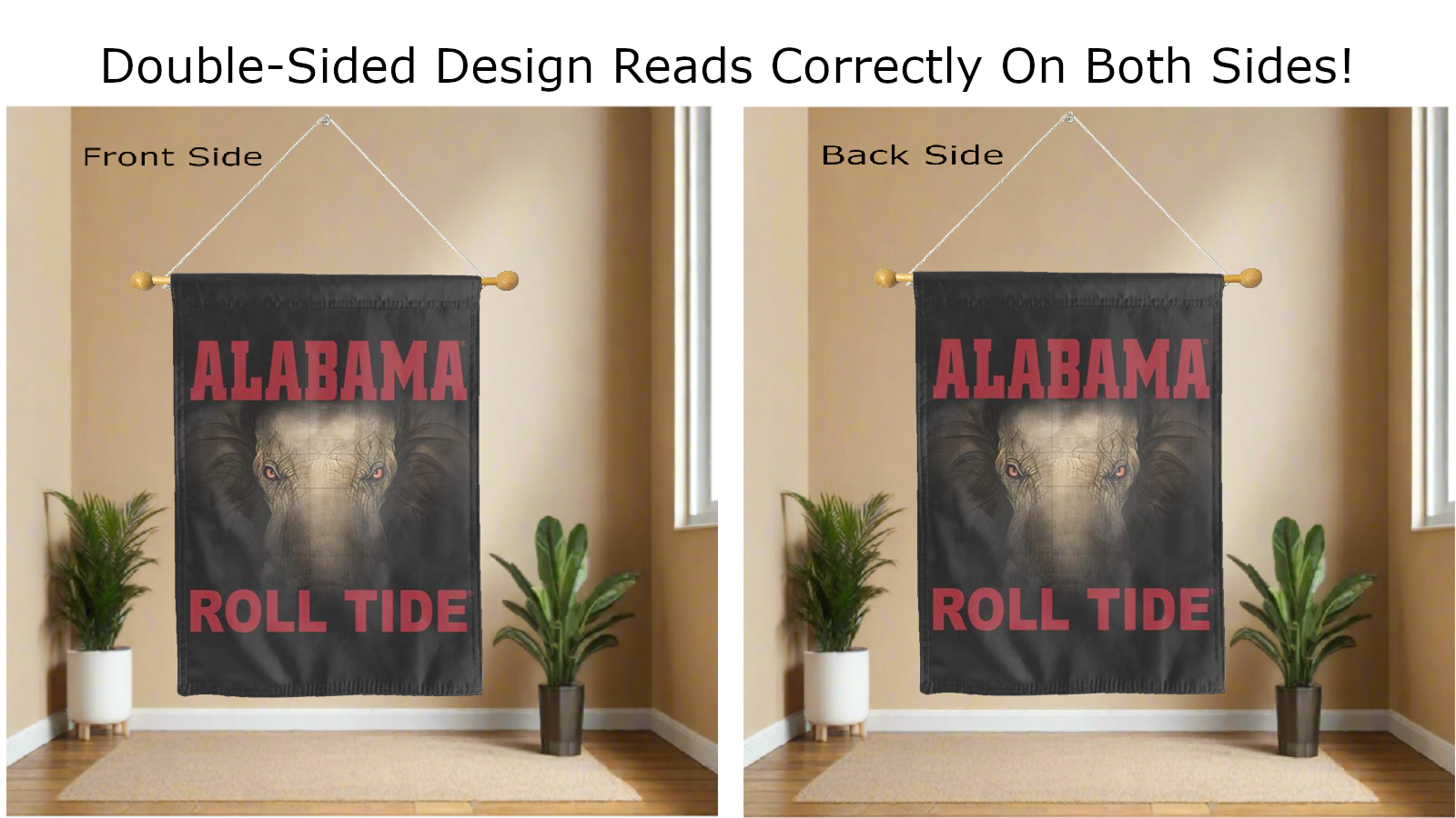Break the monotonous look of your room with this Officially Licensed University of Alabama Roll Tide Double Sided House Flag! Measuring 30" x 40", this house flag is the product of two screen-printed flags sewn together with a middle liner sewn in between the two flags to stop the see-through and allow the University of Alabama Roll Tide logo to read correctly on both sides. The sleeve across the top also makes it easy to insert the flag into a flagpole or flag hanger if you choose to hang it outside your home. Regardless of where you choose to hang it, this University of Alabama Roll Tide Double Sided House Flag is sure to reflect your school pride any day of the week.